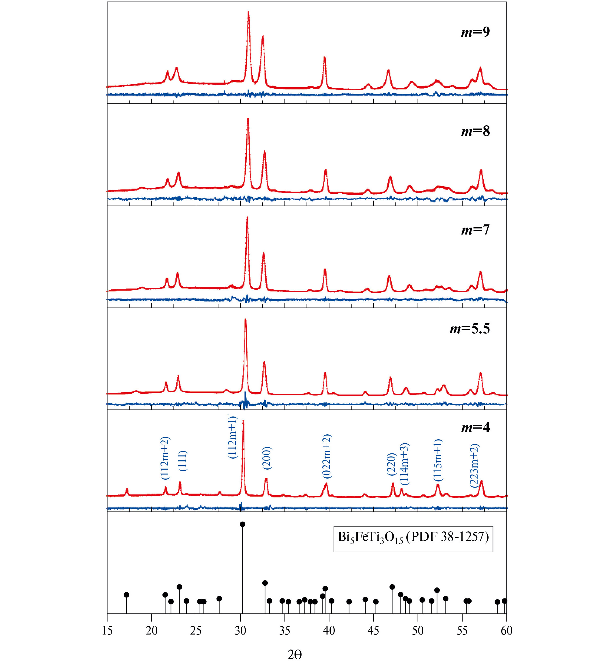 Образцы соединений Bim+1Fem-3Ti3O3m+3 (m = 4, 5.5, 7, 8 и 9) синтезированы методом твердофазных химических реакций. Подробно технология синтеза и характеризация образцов представлены в предыдущих работах [11, 18].