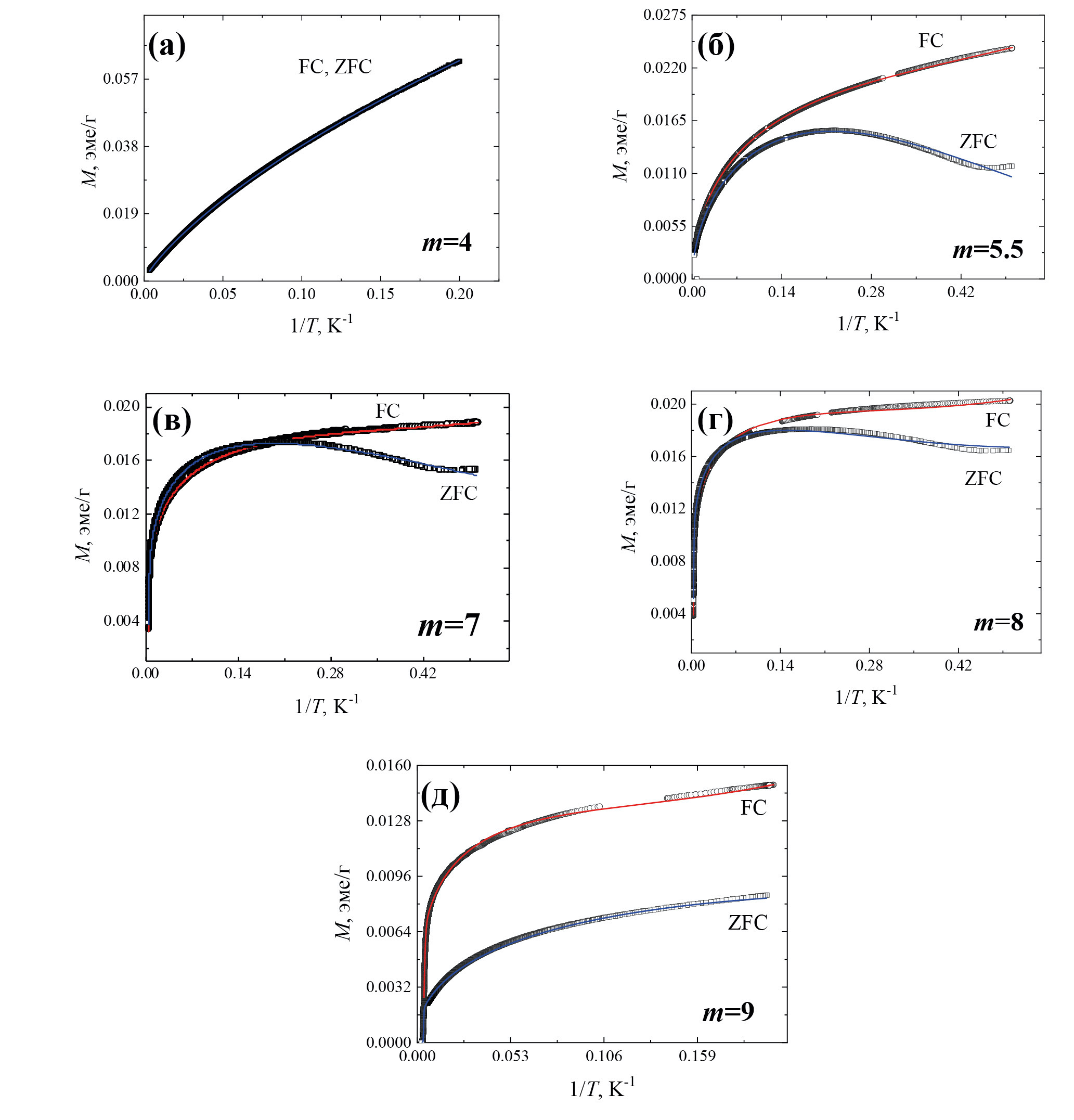По результатам авторов работы [24], нелинейность показателя в функции Аррениуса связана с динамикой движения и температурно зависимым энергетическим барьером, возникающим из-за кооперативных эффектов при низких температурах. Приведенное ниже описание температурных зависимостей намагниченности фаз Ауривиллиуса с m > 4 учитывает вклад кооперативного взаимодействия и поведение невзаимодействующих магнитных моментов в системе и, соответственно, описывается комбинацией выражением (3). В данном случае предполагается, что нелинейный показатель в выражении (3) отражает нелинейную динамику магнитных моментов при изменении температуры.