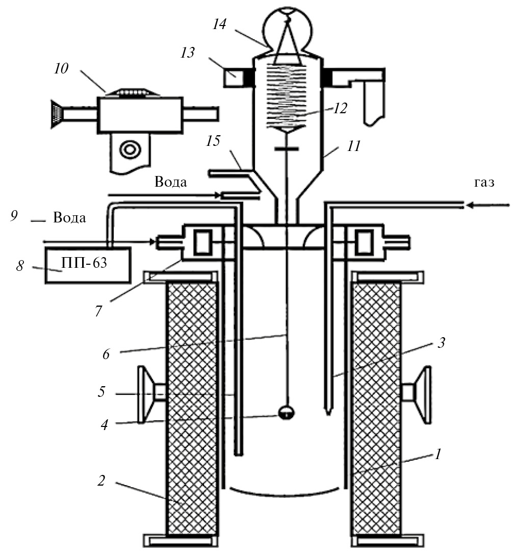 Рис. 1. Схема установки для изучения кинетики окисления металлов и сплавов: 1 – печь Таммана, 2 – чехол из оксида алюминия, 3 – газопроводящая трубка, 4 – тигель, 5 – термопара, 6 – платиновая нить, 7 – водоохлаждаемая крышка, 8 – потенциометр, 9 – вода, 10 – катетометр, 11 – чехол из молибденового стекла, 12 – пружина из молибденовой проволоки, 13 – подставка, 14 – крышка, 15 – трон и холодильник.