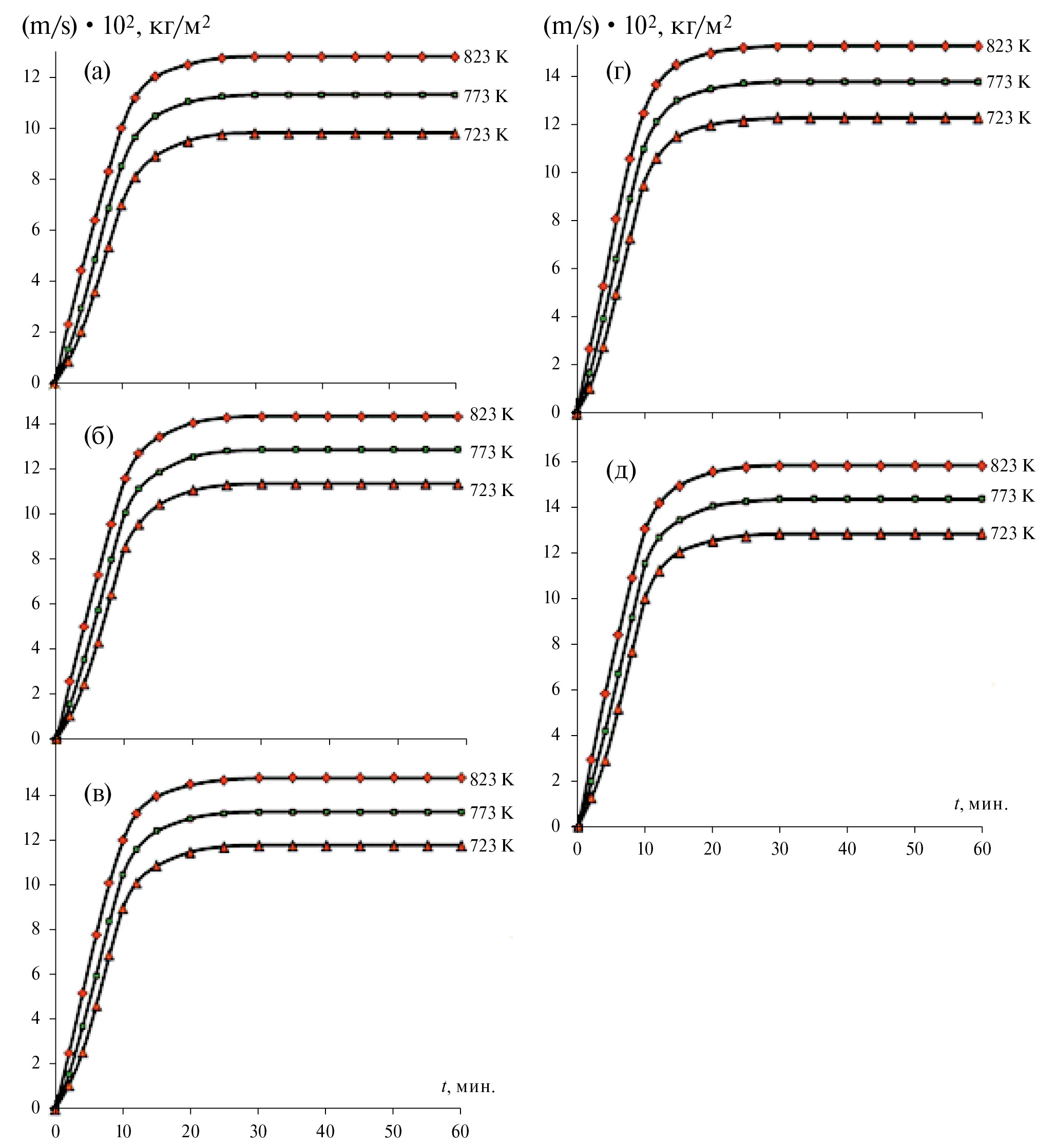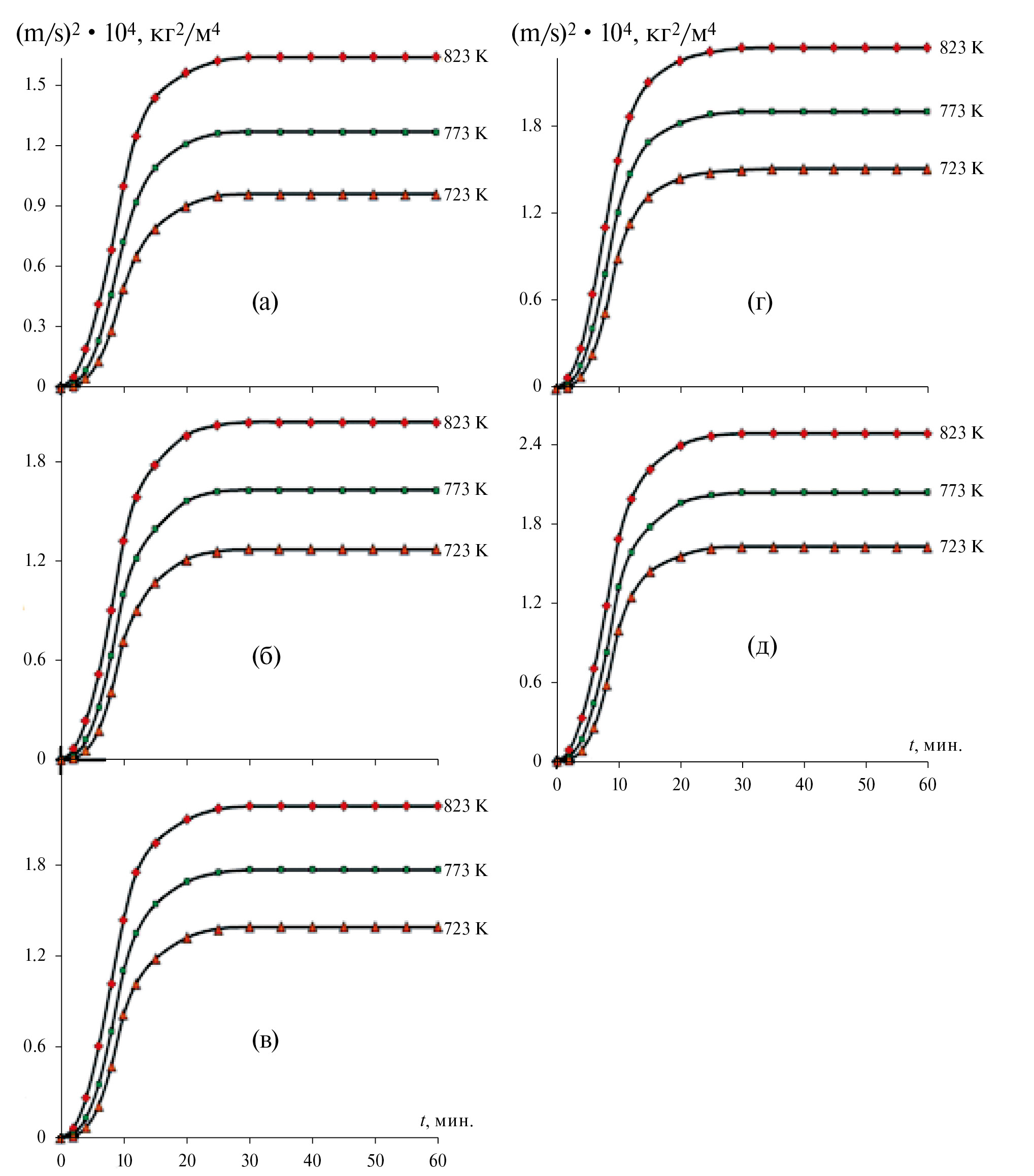 Рис. 3. Квадратичные кинетические кривые окисления алюминиевого проводникового сплава AlTi0.1 (а), содержащего кальций, мас. %: 0.01 (б); 0.05 (в); 0.1 (г) и 0.5 (д), в твердом состоянии.