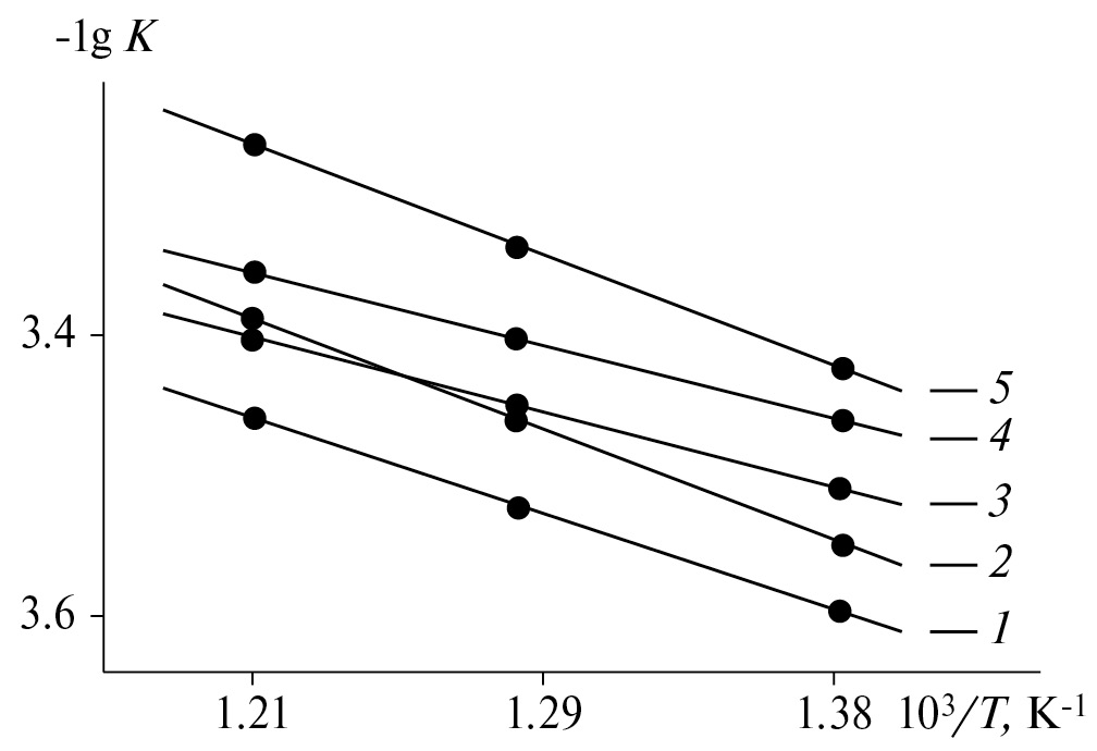 Рис. 4. Зависимости -lgК = f(1 / Т) для алюминиевого проводникового сплава AlTi0.1 (1), содержащего кальций, мас. %: 0.01 (2), 0.05 (3), 0.1 (4) и 0.5 (5).