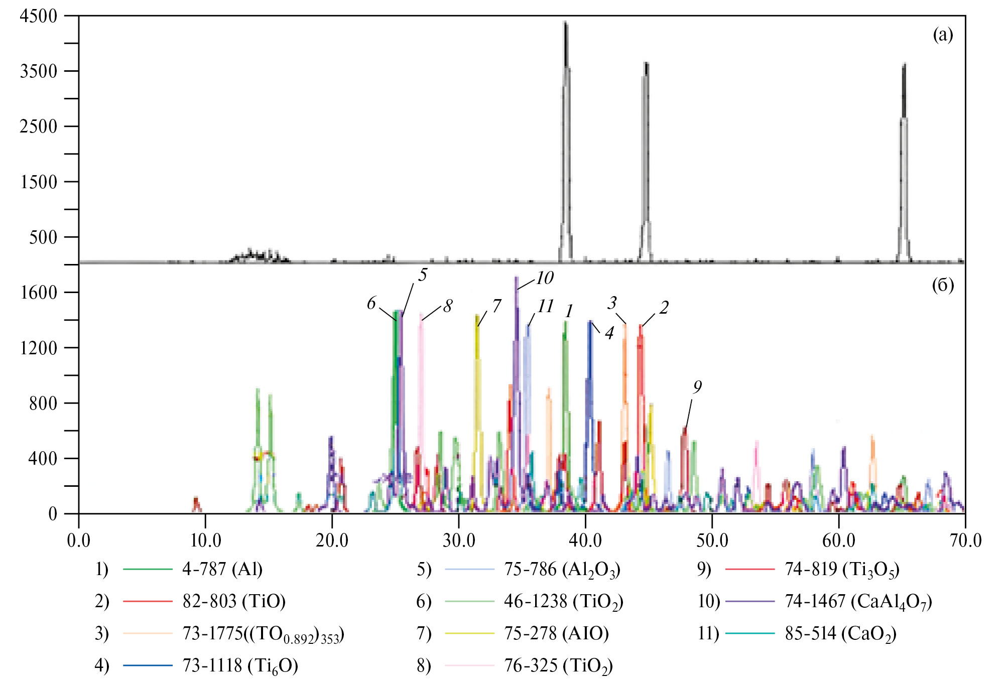 Рис. 6. Дифрактограммы продуктов окисления алюминиевого проводникового сплава AlTi0.1 (а) с 0.5 мас. % кальцием (б).
