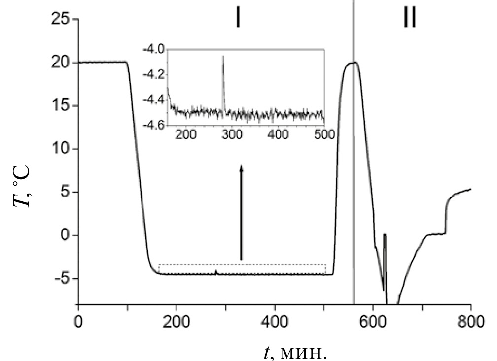 Рис. 1. Типичная экспериментальная кривая; область I – под давлением метана 12.5 МПа, экзотермический эффект соответствует образованию гидрата; область II – вне области стабильности гидрата (0.2–0.3 МПа метана), экзотермический эффект соответствует кристаллизации льда, плато при 0°С – плавлению льда. Сплошная вертикальная линия соответствует границе между областями I и II.