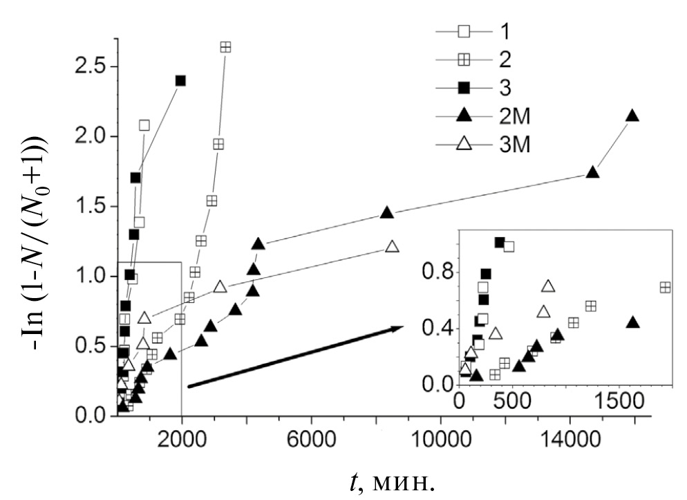 где N – число образцов, в которых нуклеация произошла до момента времени t (экспериментальные данные), N0 – общее число образцов, J – скорость нуклеации. Из-за небольшого количества экспериментальных точек мы даем только оценки величин скоростей нуклеации. В экспериментах типа (2) кривая лежит значительно ниже полученных в экспериментах (1) и (3). До 2500 мин оцененная скорость нуклеации оказалась равной 0.00042(2) мин-1, для последних четырех точек – 0.0017(4) мин-1. Таким образом, характер поверхности стекла оказывает значительное влияние на нуклеацию гидрата метана в сделанных из этого стекла ячейках. Повышение гидрофильности поверхности увеличивает наблюдаемые времена нуклеации (уменьшает скорость нуклеации). Это соответствует имеющимся в литературе данным (например, [30–32]), что присутствие гидрофобных поверхностей способствует нуклеации гидрата. Отметим, что в литературе имеются и противоположные результаты [33].
