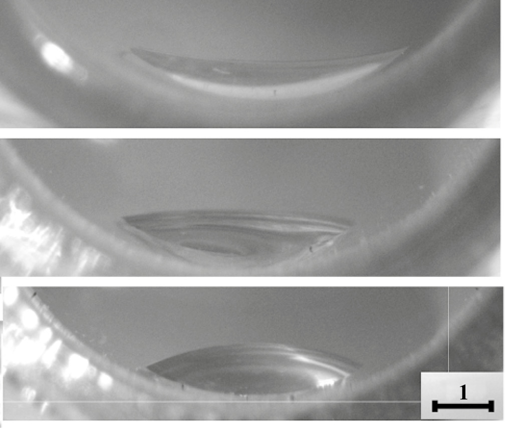 Чтобы более детально прояснить особенности гидратообразования, в растворах малоновой кислоты были выполнены три эксперимента с визуальным наблюдением роста гидрата (рис. 5). Во всех трех экспериментах нуклеация гидрата произошла на поверхности контакта водный раствор – стенка (рис. 5б), скорость роста гидратного кристалла на стенке составляла 0.04(3) мм c-1. Отметим, что в выполнявшихся нами ранее экспериментах с чистой водой нуклеация всегда происходила на трехфазной линии контакта. Далее происходил рост гидратной пленки по поверхности раствора со скоростью 1.22(6) мм c-1, рост игольчатых кристаллов гидрата в объем раствора (скорость 0.045(6) мм c-1). Все указанные процессы наблюдались ранее [25], их скорости удовлетворительно соответствуют литературным данным. Последней стадией роста гидрата здесь стал медленный рост пленки гидрата по стенкам кюветы, скорость этого процесса составила 0.008(4) мм c-1. Можно предположить, что лимитирующей стадией роста гидратного кристалла на поверхности стекло – раствор и роста игольчатых кристаллов в объем раствора является диффузия гидратообразователя к растущим поверхностям. Это обуславливает близость скоростей этих процессов. В случае роста пленки гидрата по стенкам кюветы лимитирующей стадией, вероятнее всего, является пленочный перенос воды [34], что делает этот процесс наиболее медленным. При росте пленки гидрата по стенкам кюветы происходило понижение уровня жидкости, что подтверждает сделанное выше предположение о потере теплового контакта между термопарой и образцом после образования гидрата.