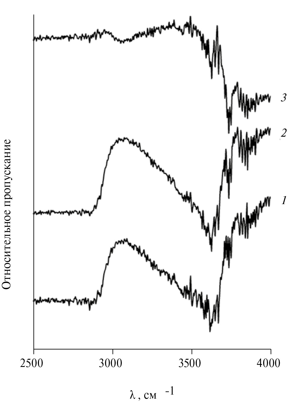 Чтобы проверить это предположение, были сняты ИК-спектры поверхностных групп борсиликатного стекла, обработанного по методам (б) и (в). Участки спектра, соответствующие областям валентных колебаний гидроксильных групп, приведены на рис. 4. Образец, обработанный по методу (а), использовался как образец сравнения. Во всех исследованных точках поверхности образца, обработанного по методу (б) (линия 1 на рис. 4), спектры были практически одинаковыми. Для образца, обработанного по методу (в), примерно с равной вероятностью фиксировались два типа спектров (линии 2, 3 на рис. 4). Первый из них практически не отличается от спектра образца, обработанного по методу (б), тогда как для второго спектральные полосы явно смещены в сторону более высоких волновых чисел. По данным [28, 29], такое смещение соответствует переходу от сильно ассоциированных между собой поверхностных гидроксильных групп к одиночным. Полученные спектральные данные подтверждают снижение поверхностной концентрации гидроксильных групп на некоторой части поверхности образца стекла и, соответственно, уменьшение гидрофильности поверхности. Это соответствует рассмотренным ранее данным об увеличении краевого угла для образцов, обработанных по методу (в). Таким образом, при трехсуточной выдержке образца происходила частичная дегидратация поверхности стекла. Очевидно, что на обработанной по методу (а) поверхности стекла содержание гидроксильных групп было еще меньше.