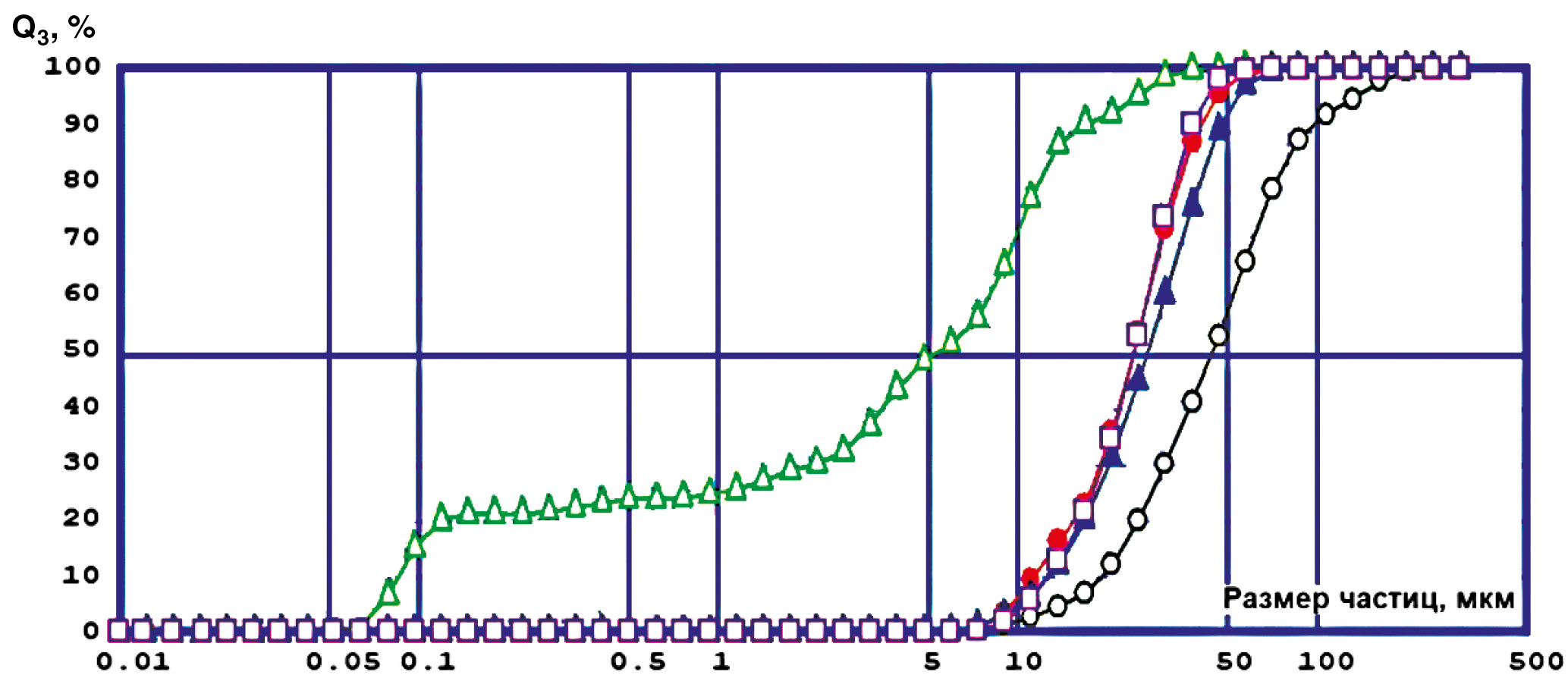 Рис. П1. Кривые интегрального распределения частиц серы по размерам после измельчения в шаровой мельнице с различными диспергаторами: ○1 – исходная сера; ●2 – с крахмалом; Δ3 – с каолином; ▲4 – с аробиногалактаном; □5 – с аэросилом.