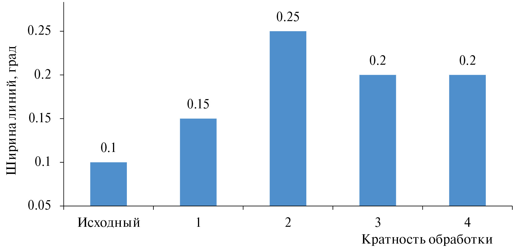 Рис. П3. Зависимости интегральной ширины рентгеновских дифракционных линий серы от кратности обработки в центробежной мельнице.