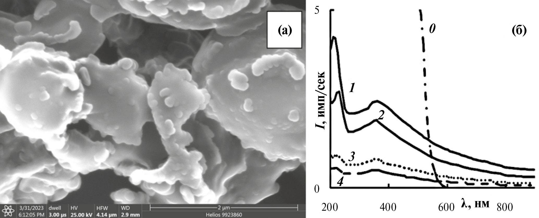 Рис. 4. СЭМ-снимок частиц порошка из гидрозолей серы (а) и УФ-спектры частиц серы в разбавленных водных растворах (б): 0 – исходный полисульфид кальция, 1 – концентрация серы в растворе 0.7 г/л, 2 – 0.4 г/л, 3 – 0.04 г/л, 4 – 0.02 г/л.