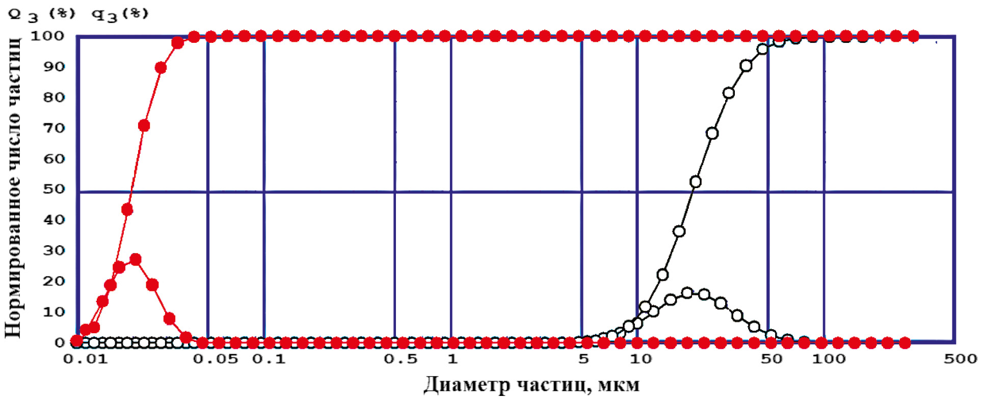 Рис. 5 Интегральное и дифференциальное распределение частиц серы в суспензии при 25°C в разные промежутки времени: (●1) – в момент образования, (○2) – через 100 мин.