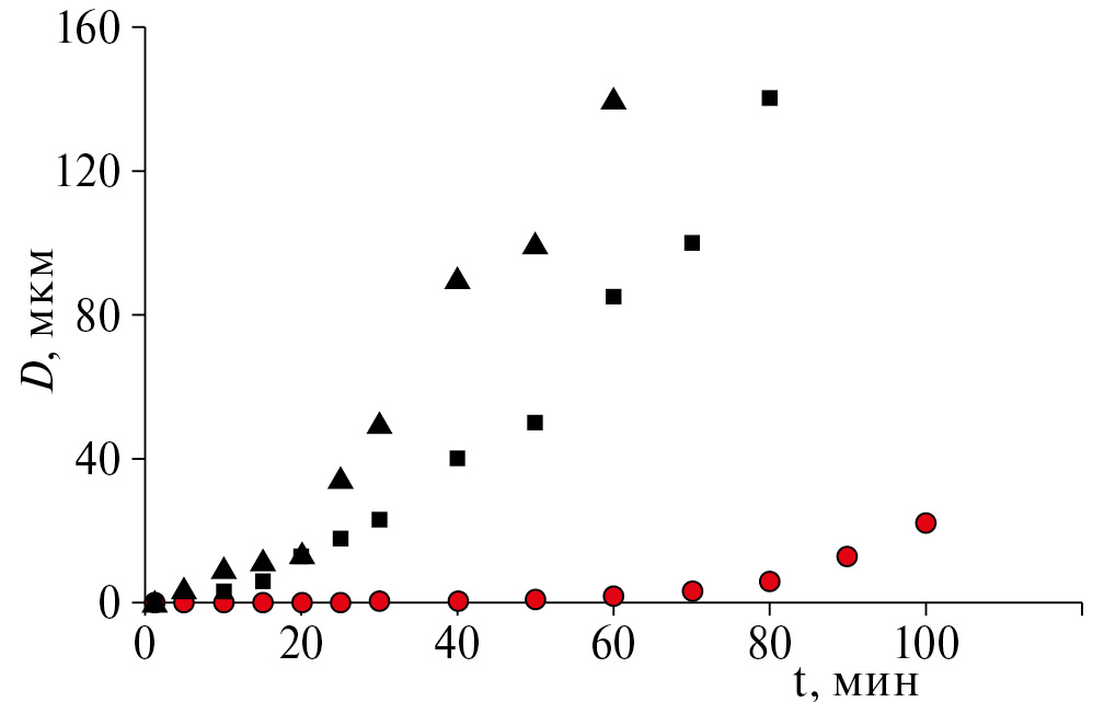 Рис. 6. Зависимости размеров частиц серы от времени, полученные при разных температурах: ●1 – при 25°C; ■2 – при 50°C; ▲3 – 75°C.