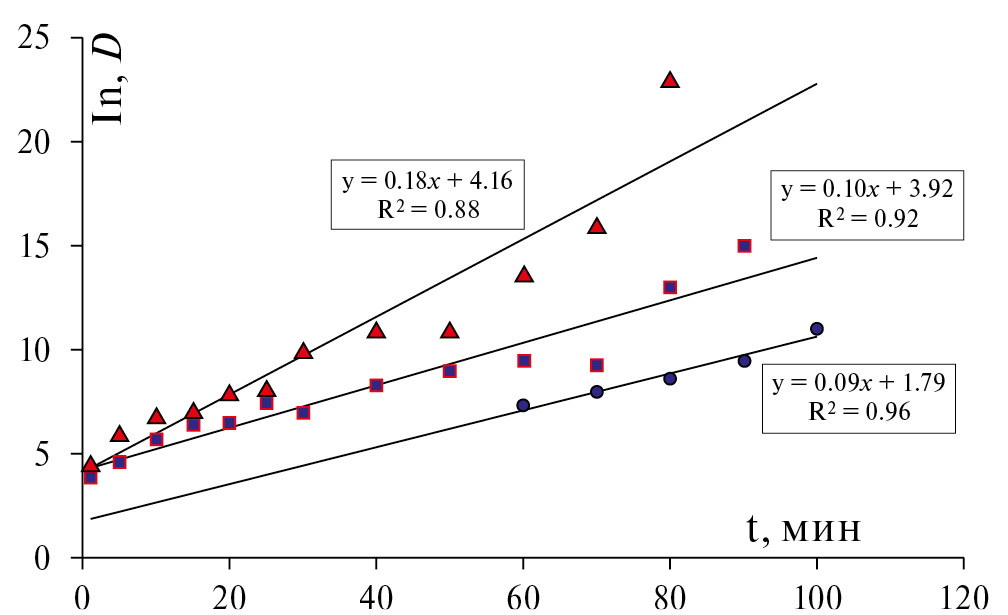 Исследовать их в таком виде трудно, поэтому мы построили логарифмическую зависимость ln(D) от времени t (рис. 7). Полученные три новые зависимости аппроксимируются линейной функцией с разными наклонами, отвечающими разным скоростями укрупнения или изменения размера частиц D(t) = D0 + tg(α) t, где t – время наблюдения, D0 – начальный размер, с которого начинается измерение, α – угол наклона линии тренда, а тангенс α – логарифм натуральный скорости укрупнения V. При построении этих логарифмических зависимостей необходимо учесть тот факт, что при температуре 25°C зависимость от времени наблюдения размеров частиц от нуля до 60 мин мала. Поэтому мы их при построении зависимостей на рис. 7 не учитываем и строим зависимость для 25°C со времени, равного 60 мин. Таким образом, учитывая экспоненциальную зависимость процесса укрупнения частиц при анализе последней, на рис. 6 мы обрезаем функции сверху, чтобы показать все три функции (показываем зависимости размеров от времени от 0 до 160 мкм), а на рис. 7 обрезаем снизу (приводим зависимости при 25°С для интервала времени наблюдения от 60 мин до 100 мин).