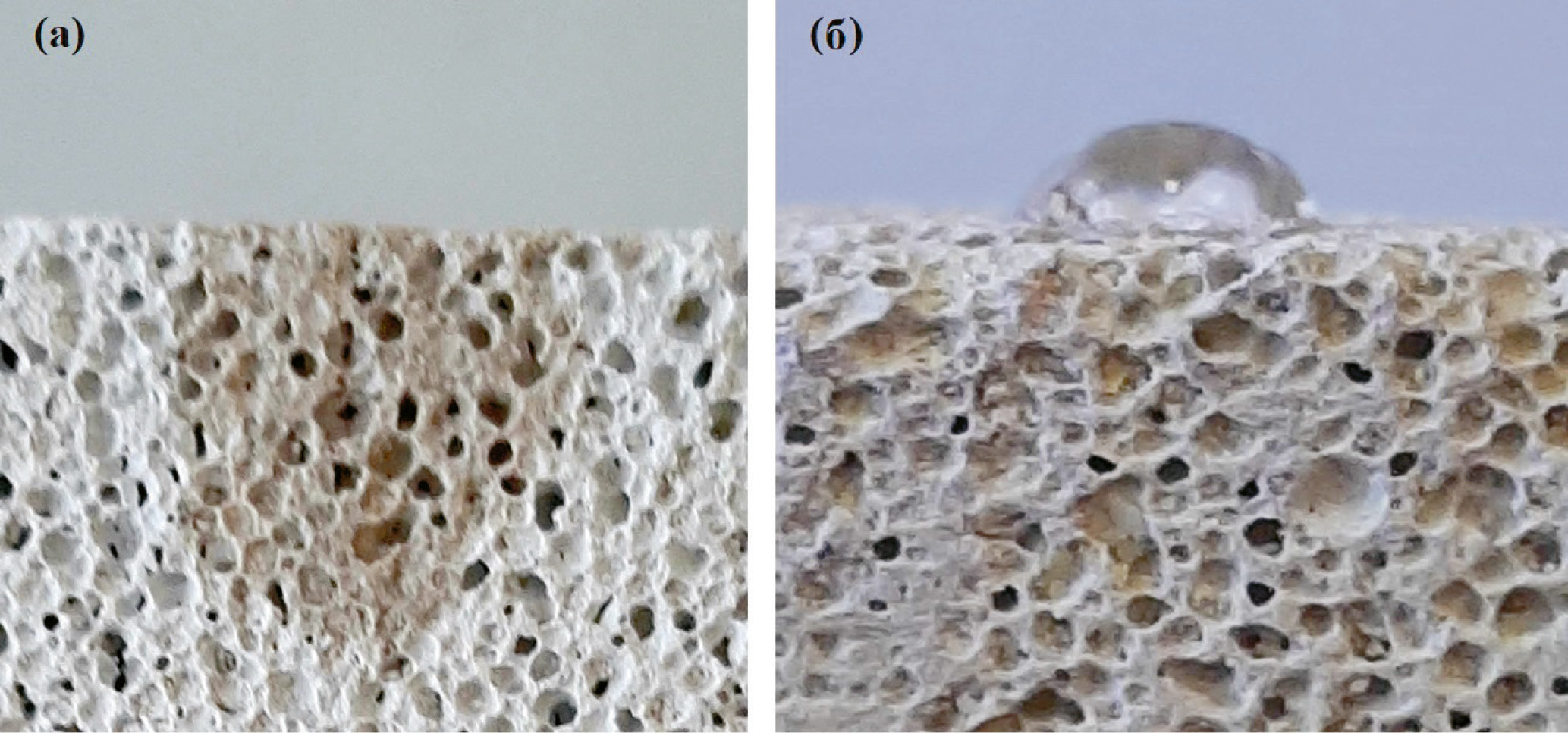 В этом аспекте представляет интерес гидрофобизация неорганических пористых поверхностей, каковыми являются большинство строительных материалов (бетон, газобетон, кирпичи и плитки). В качестве такого объекта был выбран газобетон, который содержит много полостей и хорошо смачивается водой. Для модификации газобетона его образец окунали в рабочий раствор полисульфида кальция на 2 ч, затем образец сушили при 70°С в течение суток. На рис. 8а изображен исходный образец газобетона, на поверхности которого капля воды тотчас впиталась внутрь материала. На рис. 8б изображена капля воды на поверхности модифицированного газобетона. Видно, что, несмотря на многочисленные пустоты и гидрофильность газобетона, капля не проникает внутрь материала и находится на поверхности, вплоть до полного испарения. Этот эффект трансформации гидрофильной поверхности в гидрофобную может применяться на практике с целью улучшения эксплуатационных свойств строительных материалов.