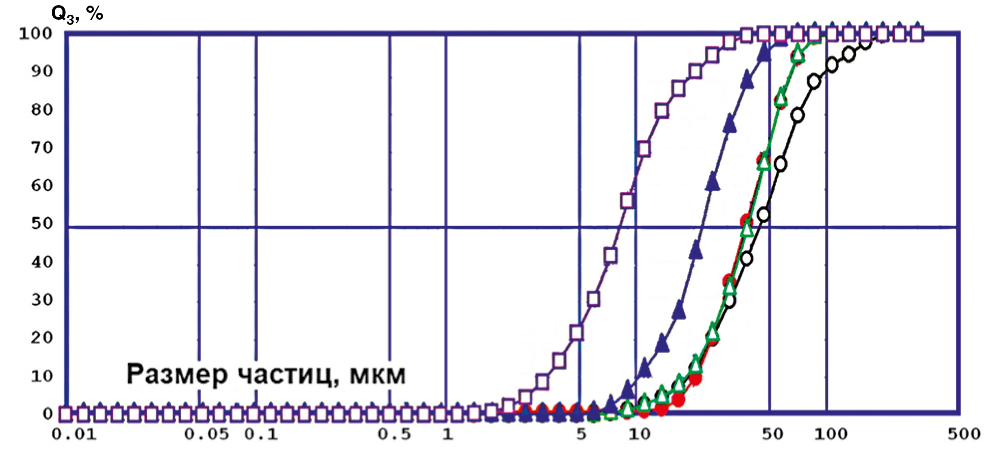 Рис. 1. Кривые интегрального распределения частиц серы по размерам после измельчения в центробежной мельнице: ○1 – исходная кривая; ●2 – после однократного измельчения; Δ3 – после двукратного измельчения; ▲4 – после трехкратного измельчения; □5 – после четырехкратного измельчения.