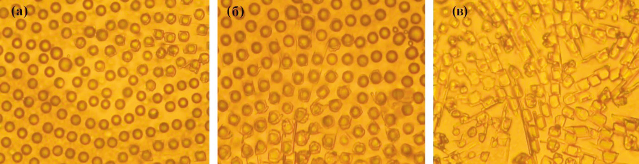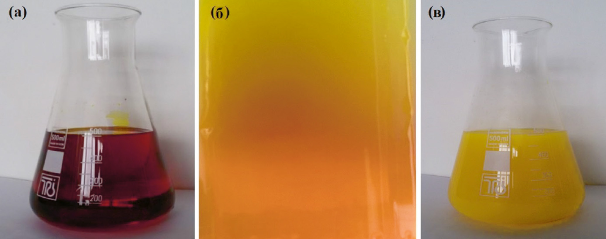 При разбавлениях водой более чем в 100 раз прозрачный рабочий раствор полисульфида кальция (рис. П2а) с 0.5% содержанием ПАВ сульфонала мутнеет с образованием гидрозоля серы. На рис. П2б показано начало появления гидрозоля серы, завершающееся образованием непрозрачной коллоидной раствор-суспензии на рис. П2в. Сразу после добавления 1 мл рабочего раствора с 0.5% содержанием ПАВ в 99 мл воды начинается формирование наноразмерных частиц серы, которые со временем укрупняются [29]: размер первоначальных частиц располагается в интервале 10–50 нм (средний же размер частиц составляет ≈ 20 нм); со временем в течение 1 ч эти частицы дорастают до 1–50 мкм при среднем размере ≈ 10 мкм.