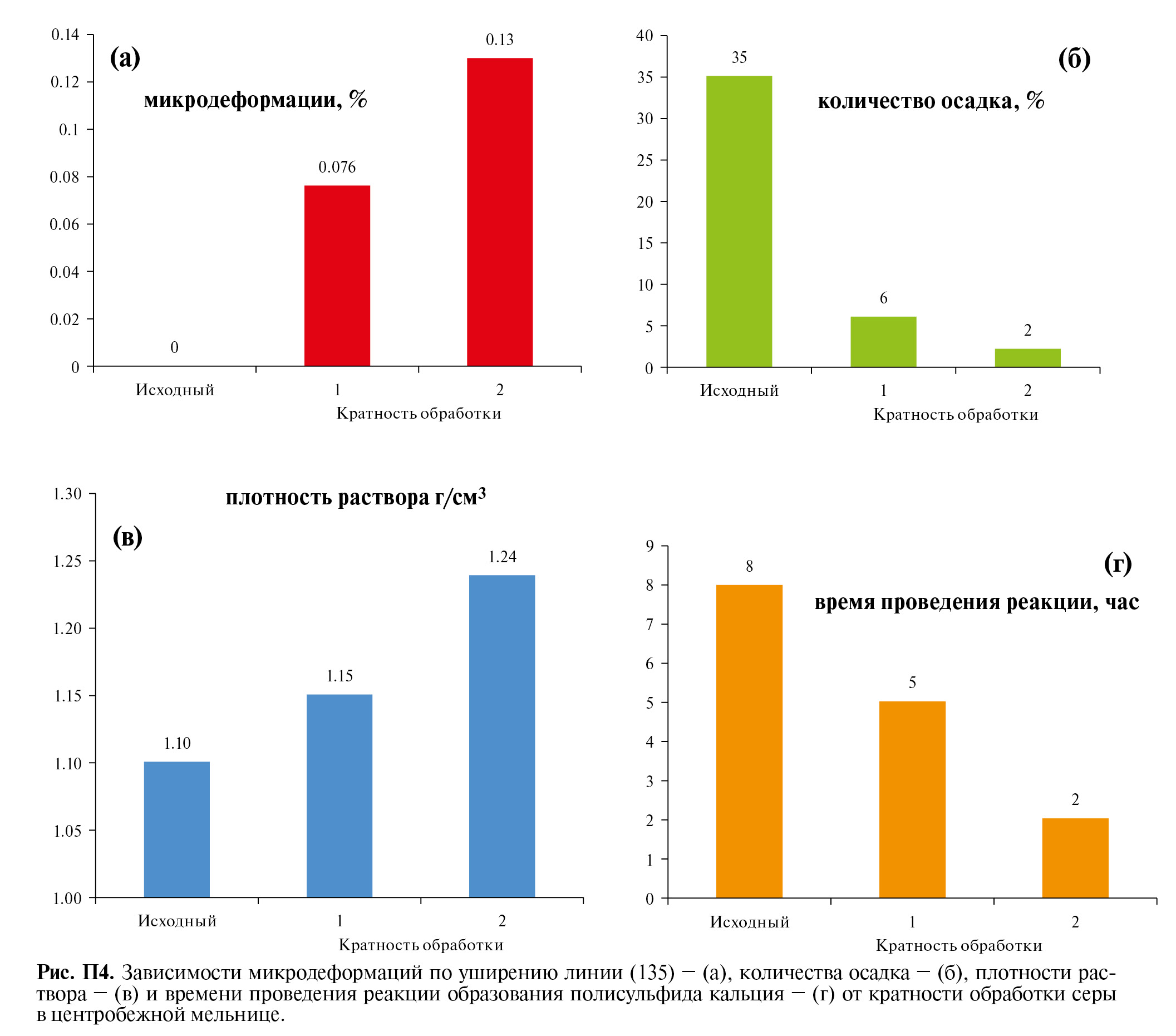 Как правило, синтез полисульфида кальция в системе S−CaO−H2O осуществляется при атмосферном давлении и температуре 100°C. Было установлено, что механическая активации серы не только в разы ускоряет процесс получения полисульфида кальция, но и позволяет существенно повысить выход целевого продукта реакции CaSn (n = 2–6 [50]) с увеличением его концентрации, которая напрямую связана с плотностью раствора. При этом уменьшается и количество исходных и побочных реакционных продуктов как в осадке, так и в растворе. Как подтверждение дадим сравнительные характеристики синтеза растворов полисульфида кальция из исходной серы и таковой, пропущенной 1 и 2 раза через центробежную мельницу на рис. П4: а – рост микроискажений решетки с 0% до 0.13% указывает на увеличение реакционной способности активированной серы; б – количество отходов уменьшается с 35% до 2%; в – плотность раствора возрастает с 1.10 до 1.24 г/см3; г – время синтеза сокращается с 8 до 2 ч, и это происходит при уменьшении температуры процесса с рекомендуемых 100 до 90°C.