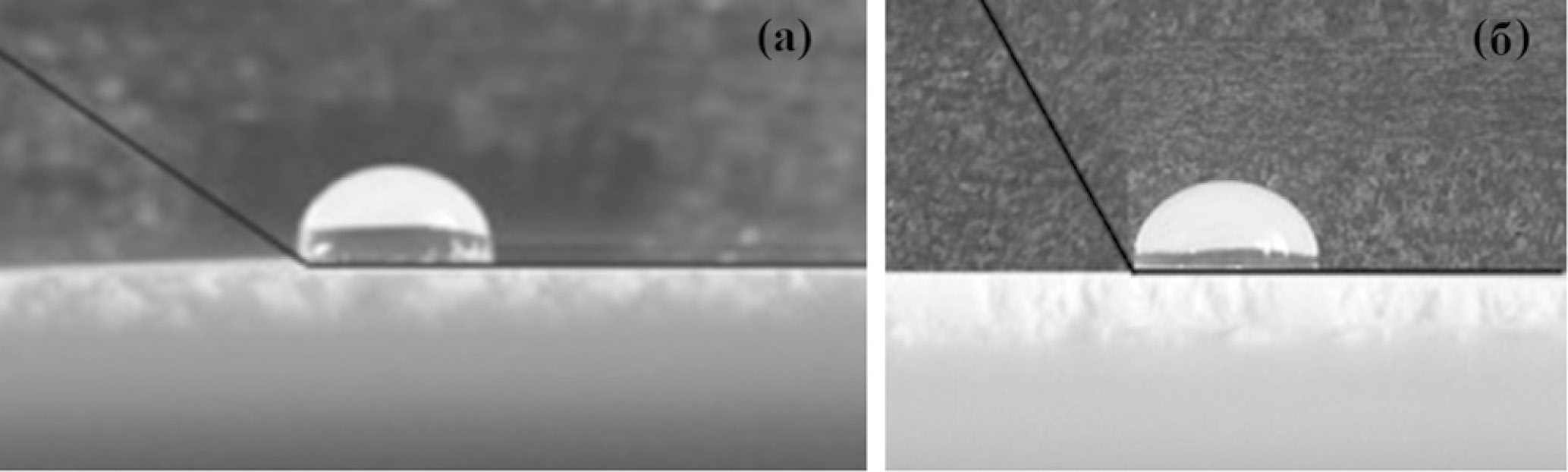 Рис. 8. Изображение капли воды на поверхности газобетона: а – на поверхности необработанного газобетона; б – на поверхности газобетона, обработанного раствором полисульфида кальция.