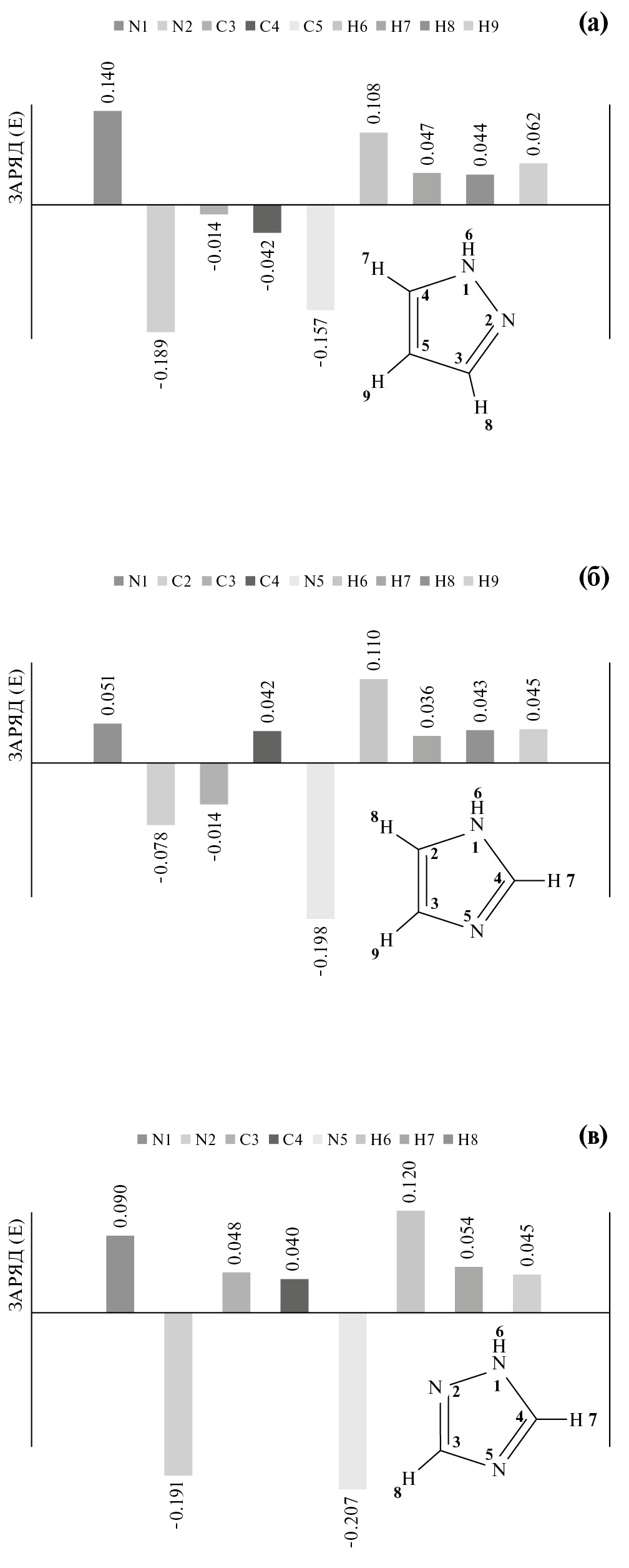 Рис. 2. Суммарные атомные заряды по Малликену для 1Н-пиразола (а), 1Н-имидазола (б), 1Н-1,2,4-триазола (в).