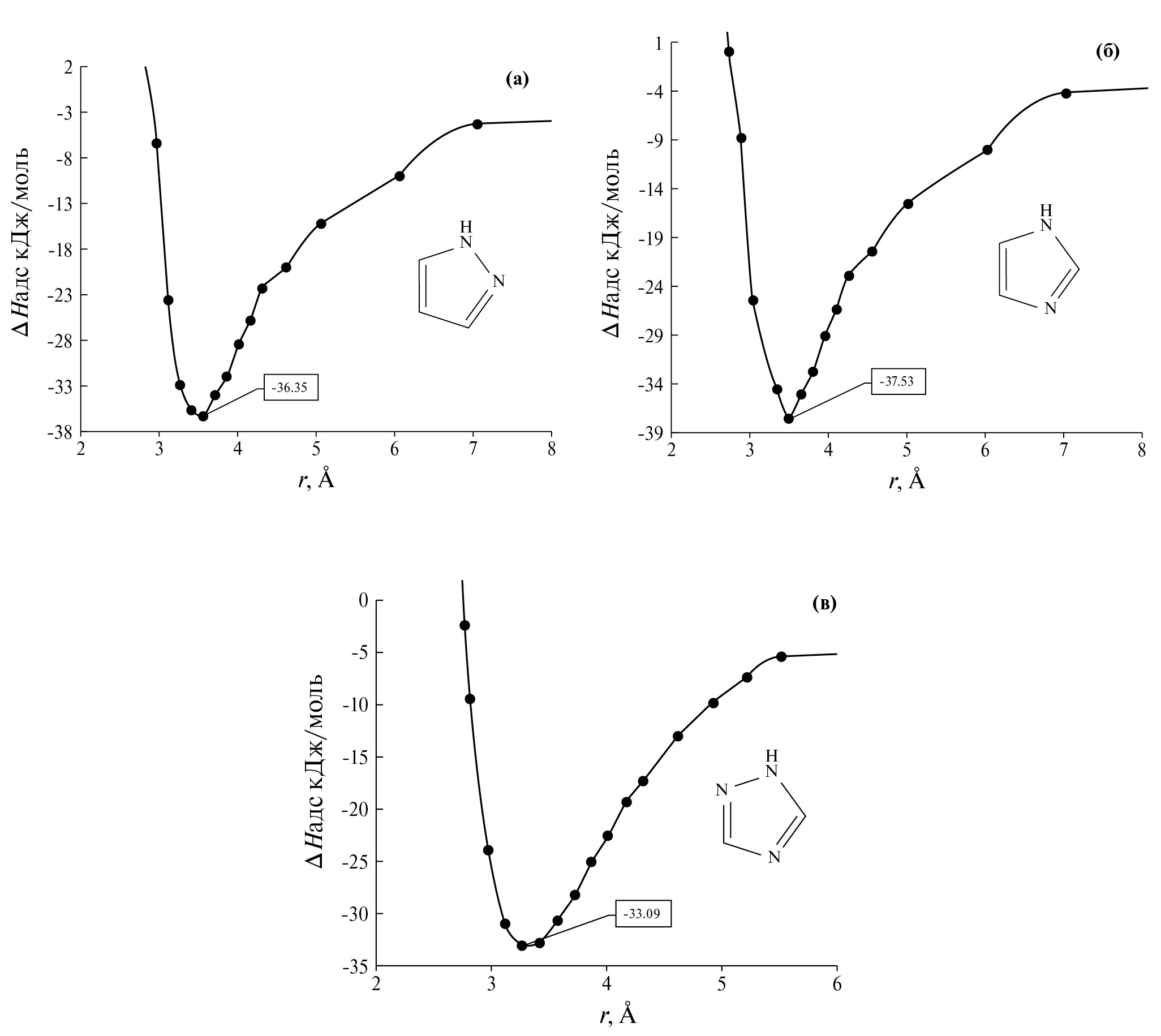 Рис. 3. Потенциалы Леннард-Джонса, рассчитанные для случая адсорбции 1Н-пиразола (а), 1Н-имидазола (б), 1Н-1,2,4-триазола (в) на поверхности графена.