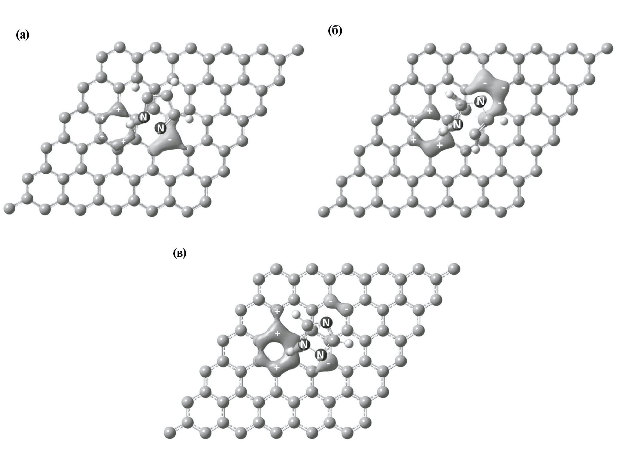 Рис. 4. Трехмерные графические изображения электронных возмущений в системе «Х — графен», где Х: (а) 1Н-пиразол, (б) 1Н-имидазол, (в) 1Н-1,2,4-триазол. Знаком «+» обозначены положительные возмущения, знаком «–» – отрицательные.