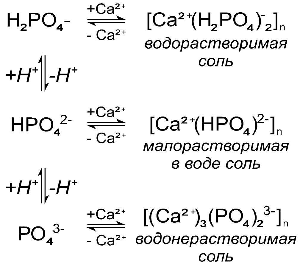 Идея двухвалентных противоионов, связанных с полиионом, стала интуитивной в биоминерализации, где обычно принято считать, что кислотные остатки играют ведущую роль в минерализации, — вероятно, из-за взаимодействия этих остатков с ионами кальция. Хорошо известно значение фосфатного буферного механизма, играющего особую роль во внутриклеточных окислительно-восстановительных процессах (ОВП) и кислотно-основном состоянии (КОС) цитоплазмы. В матриксе М, когерентно с трансформацией молекулярной структуры фосфатных ионов, протекает регуляция кальциевого метаболизма (рис. 5).