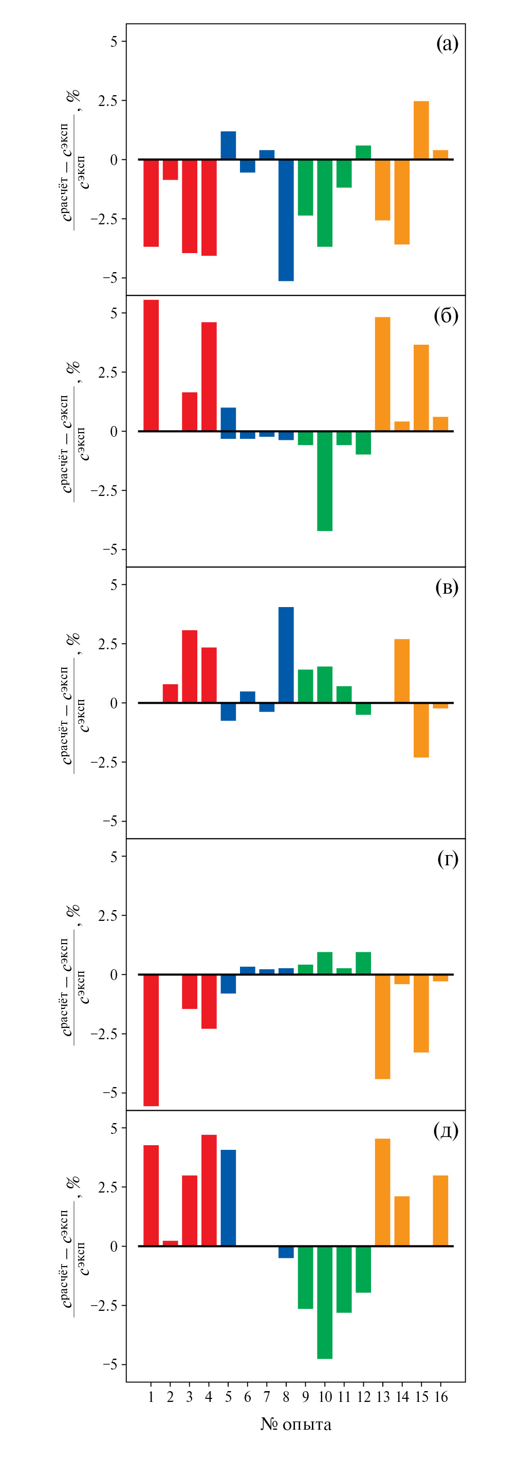 Отклонения рекомендуемых рассчитанных величин от экспериментально определенных (, %): а) ; б) ; в) ; г) ; д) при температуре T = 298.15 К в системах ди-(2-этилгексил)фосфорная кислота – вода – азотная кислота – нитрат самария – разбавитель. Столбцы: красные – циклогексан, синие – толуол, зеленые – н-гептан, оранжевые – н-додекан.