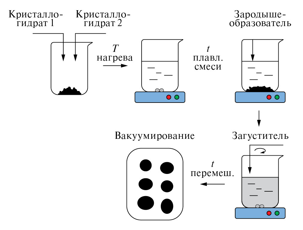 Приготовление составов осуществлялось сериями, в которых корректировались методика приготовления составов и форма содержащегося графита. Все составы, соотношение компонентов в которых указано в табл. 1, получали по схеме, представленной на рис 1. Время и температура выдерживания приготавливаемых смесей на каждой стадии методики получения приведены в табл. 2. Для устранения переохлаждения и улучшения теплофизических характеристик к Zn(NO3)2·6H2O добавлен ряд зародышеобразующих и увеличивающих теплоемкость и теплопроводность добавок, приведенных в табл. 3.