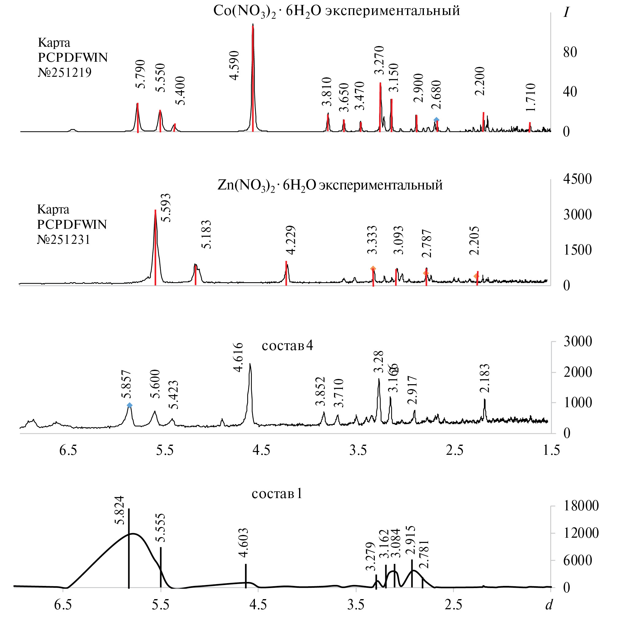 По экспериментальным дифрактограммам составов 1 и 4 на рис. 2 в сравнении с чистыми Zn(NO3)2∙6H2O и Co(NO3)2∙6H2O имеется пик, соответствующий d = 8.109 (200) и небольшое смещение пика d = 6.573 (20–2), что говорит о наличии в небольшом количестве фазы [30, 31], получившейся в результате разложения кристаллогидрата нитрата кобальта по реакции :
