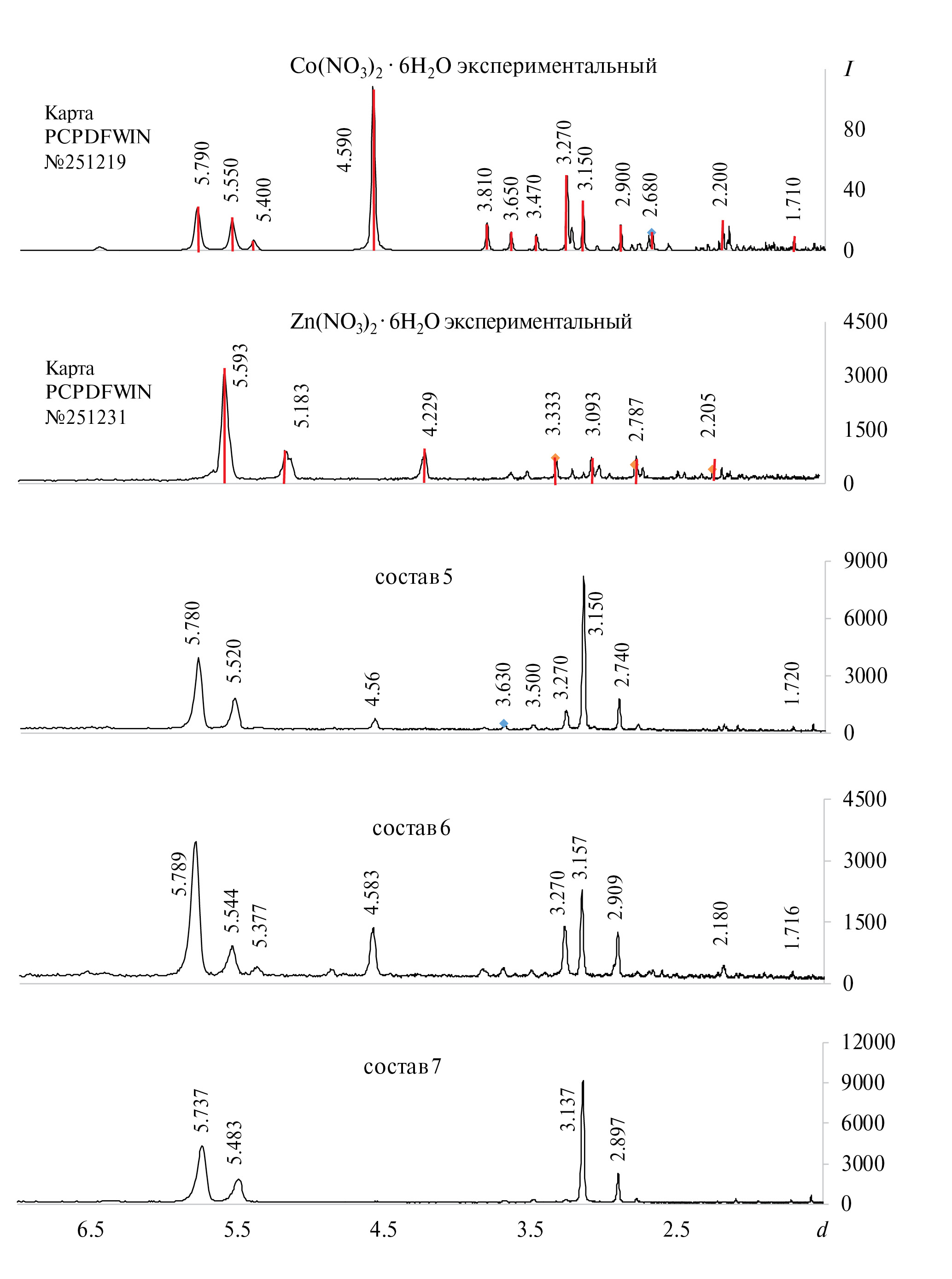 Во 2 серии синтезов ожидаемого разложения нитратов цинка и кобальта не произошло. Это подтверждается экспериментальными дифрактограммами, представленными на рис. 3. Значения межплоскостных расстояний dрасч близки к табличным значениям dэтал кристаллогидратов Zn(NO3)2∙6H2O и Co(NO3)2∙6H2O, взятых из базы данных PCPDFWIN [5].