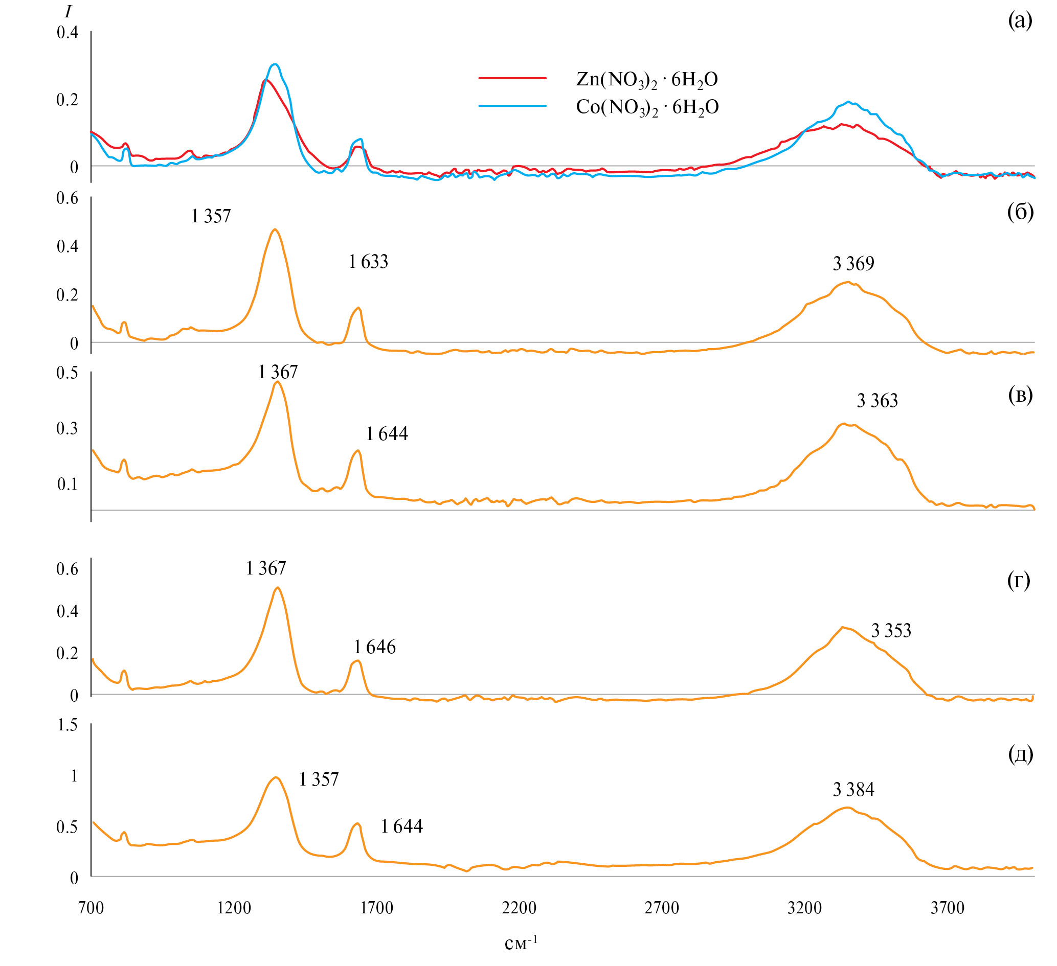 *Обозначения: 642 см-1 – ν: Zn-O; 828, 1384 см-1 – ν: N-O; 1638 см-1 – ν: H-O-H в соли; 3485 см-1 – O-H водородная связь; 3576 см-1 – ν: O-H вал. связь в соли.