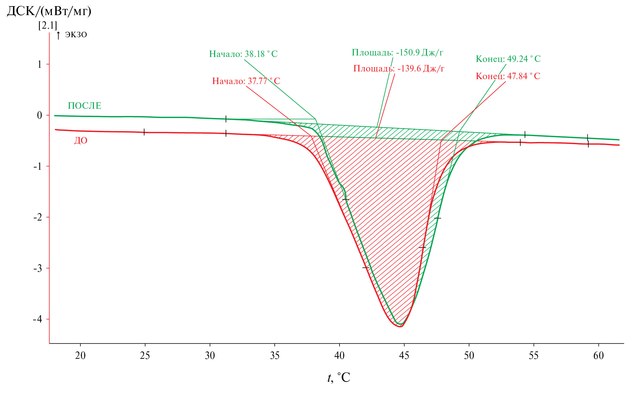 Средняя ошибка аппроксимации свидетельствует о качестве подобранной модели. Температура плавления tm и энтальпия плавления ΔHm по результатам усреднения экспериментальных составили 36.4 °C и 134 Дж/г соответственно.