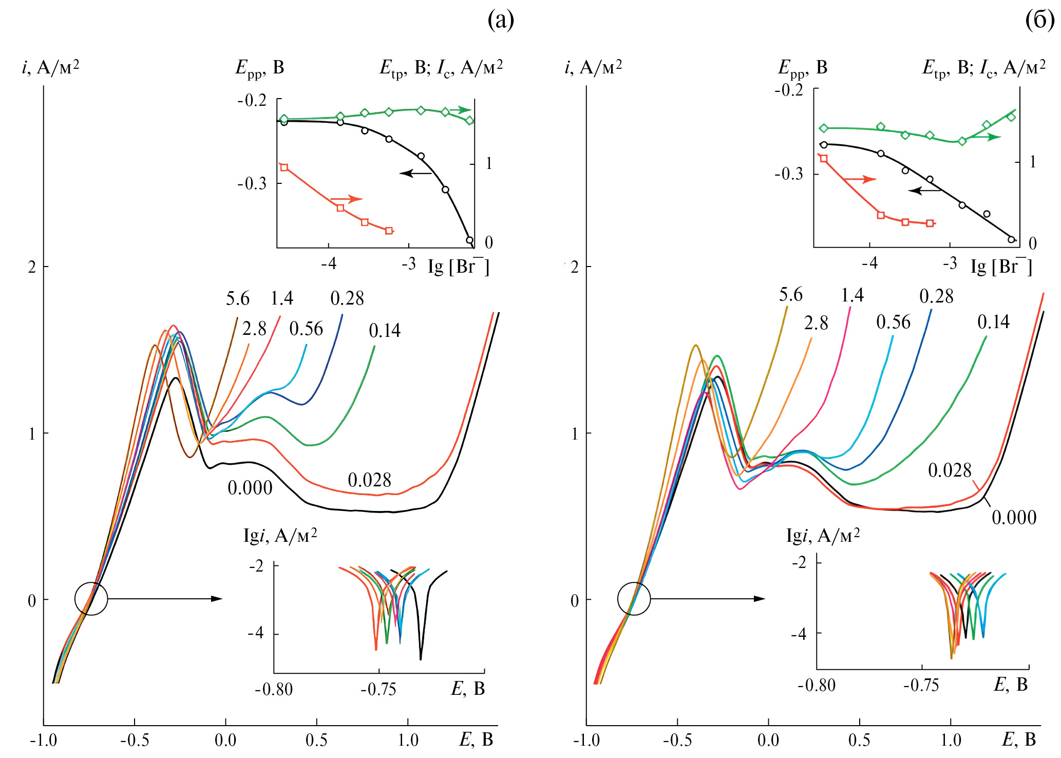 Рис. 1. Анодные поляризационные кривые образцов стали Ст3кп в ББР (pH 7.4) с добавками различных концентраций ионов Br– (a) и I– (б); цифры на кривых обозначают концентрацию галогенид-иона в г/дм3. Зависимость плотности тока анодного растворения металла i, А/м2, от потенциала образца E, В. На врезках показаны участки поляризационных кривых в окрестности потенциала разомкнутой цепи Eoc в логарифмическом масштабе плотности тока; зависимости критической плотности тока анодного растворения металла ic (1), потенциала начала пассивации Epp (2) и потенциала транспассивности Etp (3) от логарифма концентрации галогенид-иона lg[X–], где X = Br, I.