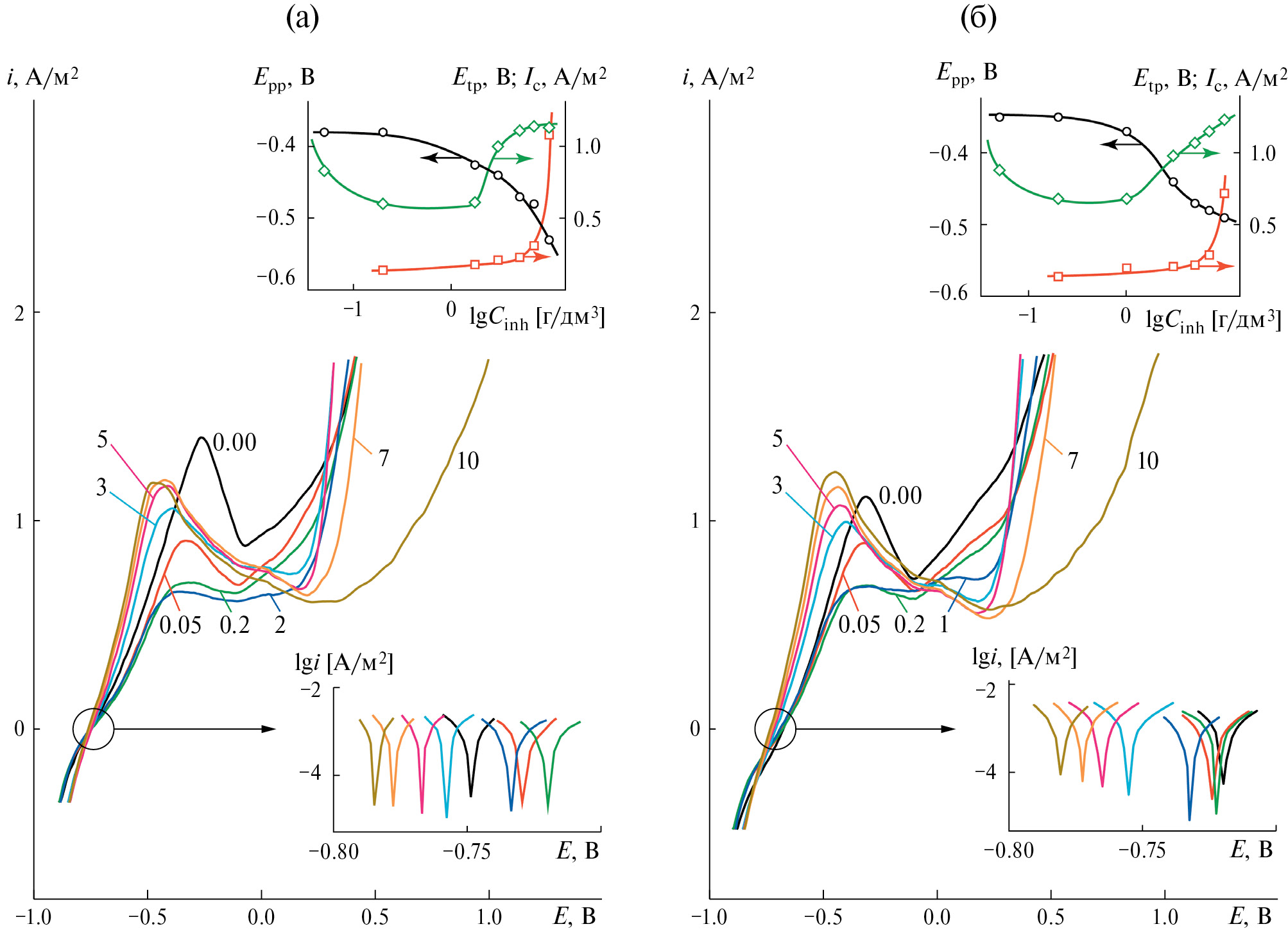 На рис. 2 представлены анодные поляризационные кривые образцов Ст3кп с добавками 1.4 ммоль/дм3 ионов Br– и I– и ингибитора ZnNTP в различных концентрациях. С увеличением концентрации ингибитора Cinh Eoc незначительно снижается. Очевидно, что увеличение концентрации ингибитора в коррозионной среде облегчает формирование пассивной пленки: Epp постепенно снижается с увеличением Cinh. Добавки уже 0.2 г/дм3 ингибитора способствуют появлению пассивной области. В небольших концентрациях ZnNTP снижает ic, с этой точки зрения оптимальная концентрация ингибитора в коррозионной среде составляет 0.2–2 г/дм3, введение ингибитора в больших концентрациях приводит к росту ic. При концентрациях ингибитора 3 г/дм3 и более в пассивной области можно выделить два участка: при более положительных значениях потенциала наблюдаются участки с пониженной плотностью тока, причем в средах с I–-ионами падение плотности тока более существенно. При Cinh < 5 г/дм3 Etp практически не меняется с ростом концентрации ингибитора, однако при больших концентрациях ингибитора наблюдается значительное увеличение Etp.