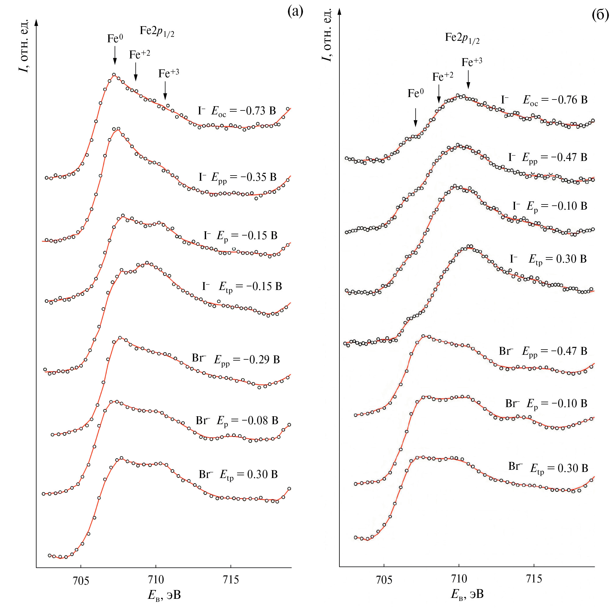 На рис. 3 а представлены РФЭ-спектры Fe2p3/2-электронов пассивных пленок, сформированных на образцах стали Ст3кп в ББР (pH 7.4), содержащем 1.4 ммоль/дм3 ионов I– или Br– при различных значениях анодного потенциала: Еос, Ерр, потенциале, соответствующем минимальному значению плотности тока в условно-пассивной области Ер, и потенциале области транспассивности Еtp. Анализ спектров показывает, что при всех значениях потенциала поверхностные пленки содержат значительное количество неокисленного железа, Fe2p3/2-спектр которого имеет максимум интенсивности при EB = 706.7–707.2 эВ. Особенно значителен вклад Fe в пленках, сформированных при низких значениях потенциала, – Еос, Ерр. В пленках, образованных при Ер и Еtp, возрастают доли окисленного железа Fe2+ (EB = 709.3–710.5 эВ) и Fe3+ (EB = 710.8–711.7 эВ). Следует отметить, что пленки, сформированные при Etp в йодидсодержащей среде, характеризуются преобладанием окисленных форм железа Fe2+ и Fe3+, в отличие от пленок, сформированных в среде с Br–.