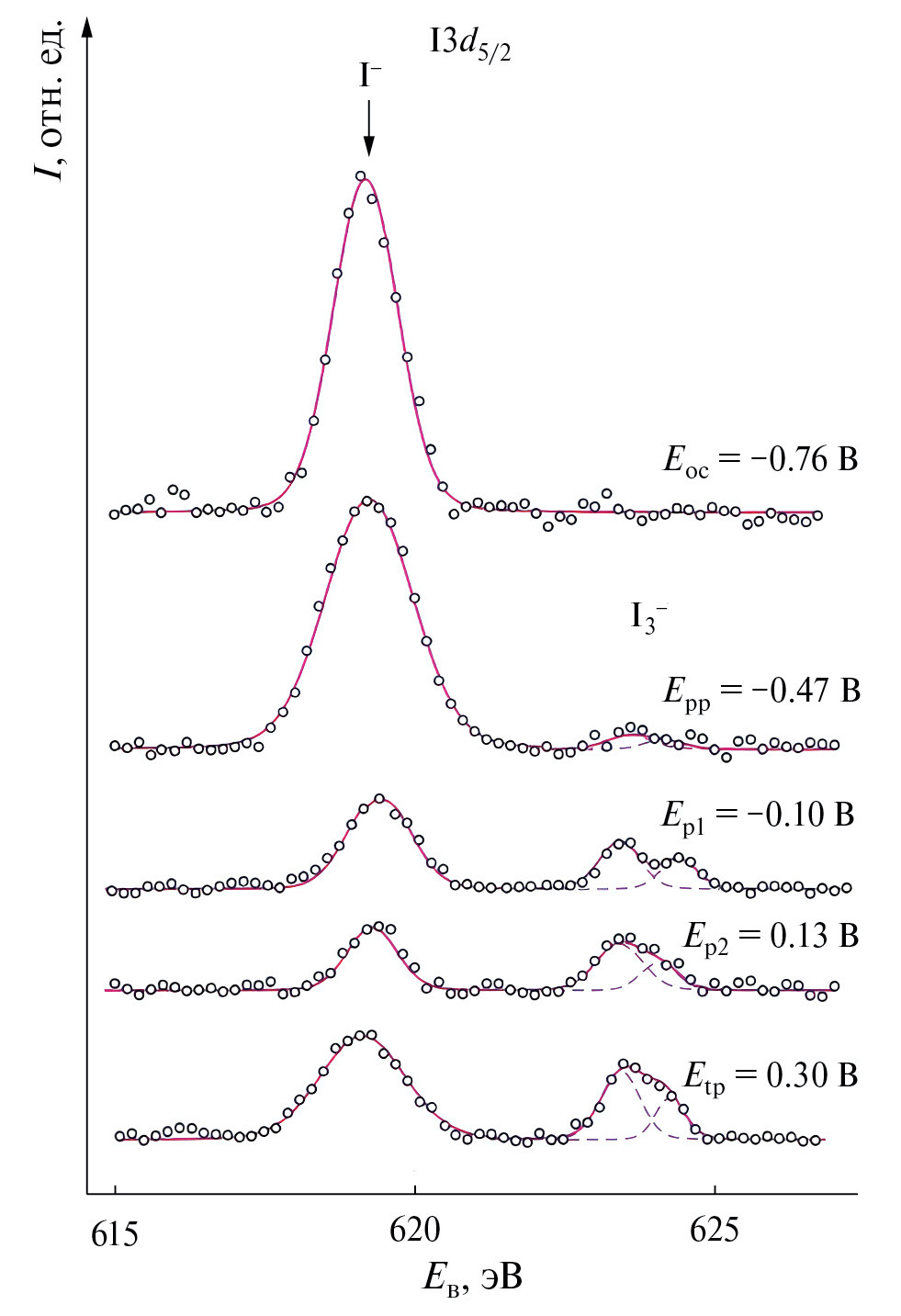 На рис. 5 представлены РФЭ-спектры I3d5/2-электронов пассивных пленок, сформированных на образцах стали Ст3кп в ББР (pH 7.4), содержащем 1.4 ммоль/дм3 ионов I– и 5 г/дм3 ингибитора ZnNTP при различных значениях анодного потенциала: Еос, Ерр, потенциалах области пассивности Ер1 и Ер2, Еtp. Очевидно, что все пленки, независимо от значения потенциала, при котором они сформированы, содержат значительное количество I–-ионов, о чем свидетельствуют максимумы на спектрограммах при EB = 619.2–619.3 эВ. Однако особенно велика интенсивность пиков I– в спектрах пассивных слоев, образованных при Еос и Ерр. С ростом потенциала формирования пленки появляются фрагменты спектра, соответствующие трийодид-иону I3–, который образуется в результате протекания реакций (4)–(6). Спектр I3– включает две составляющие с максимумами интенсивности при 623.6 и 624.5 эВ. Составляющая с ЕВ = 623.6 эВ соответствует концевым атомам I в линейной структуре I3–, составляющая с ЕВ = 624.5 эВ – центральному атому I [59]. РФЭ-спектры с послойным травлением ионами Ar пленок, сформированных в йодидсодержащих растворах, показали присутствие I– и I3– только на поверхности. В отличие от I–-ионов, Br–-ион не регистрируется в РФЭ-спектрах.