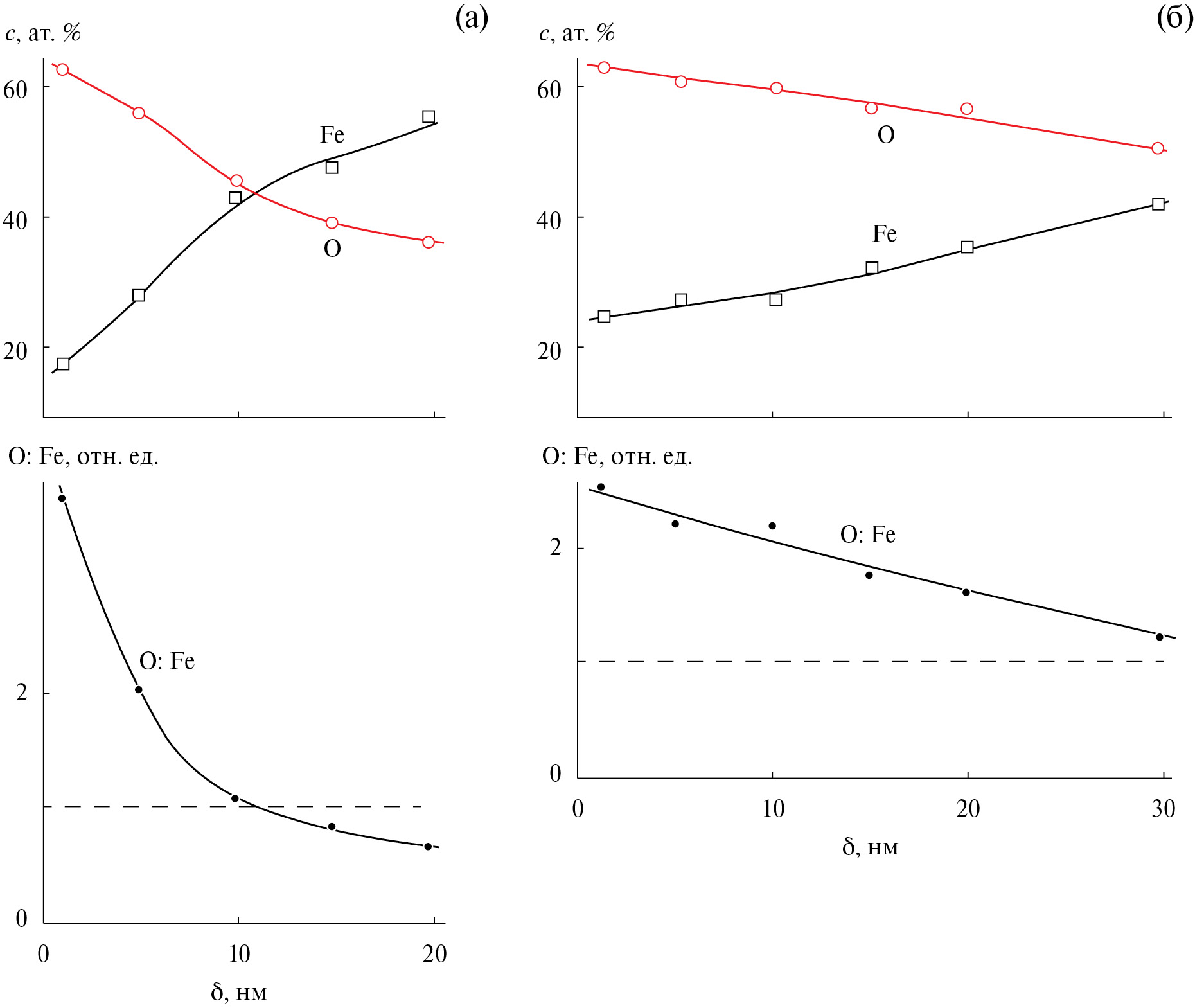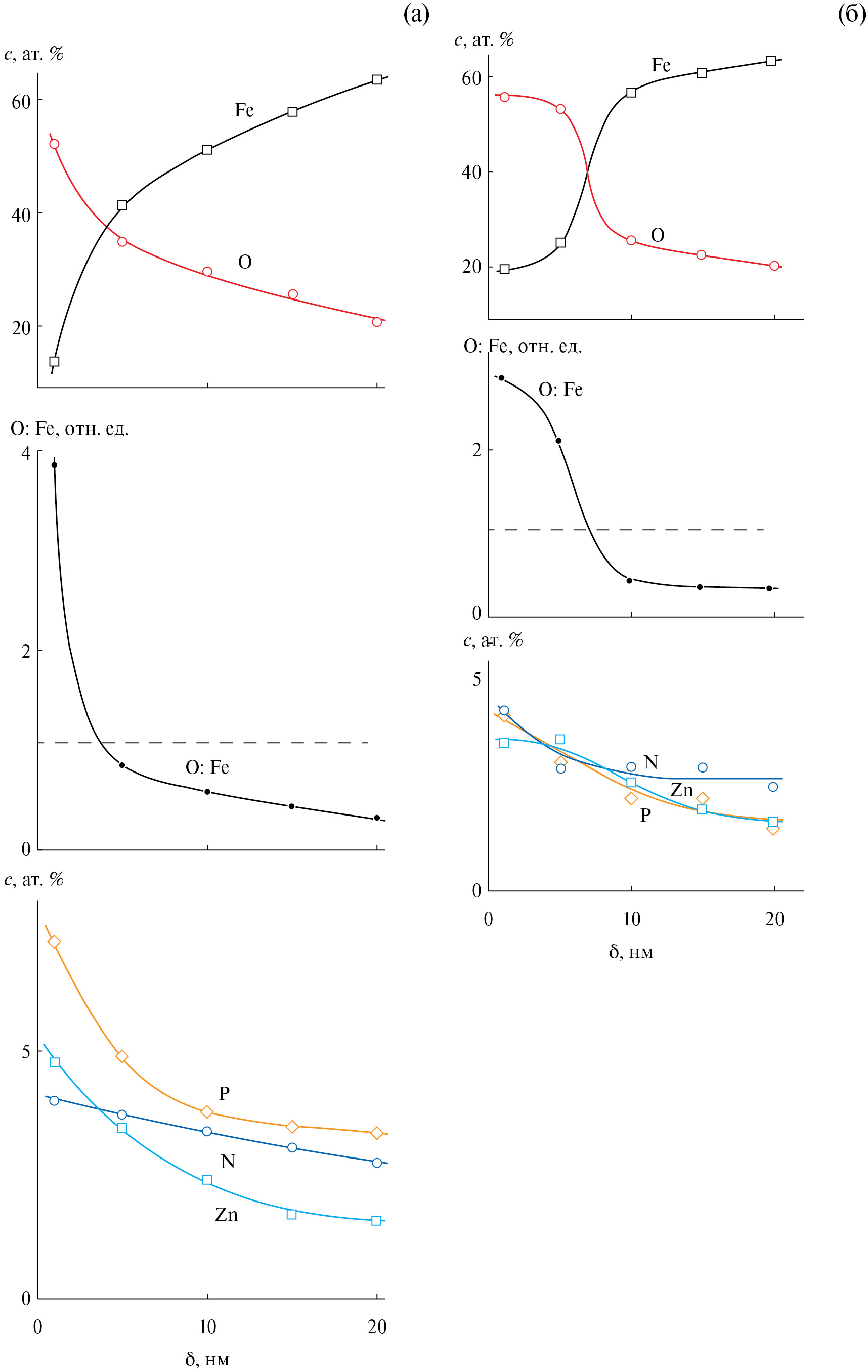 На поверхности пассивной пленки (δ = 1 нм) на образце, поляризованном в ББР с добавкой 1.4 ммоль/дм3 I– и 5 г/дм3 ZnNTP при Ер = –0.10 В (рис. 7a), доля железа составляет ~ 15 ат.%, доля кислорода – ~ 53 ат.%. На образце, поляризованном в ББР с добавкой 1.4 ммоль/дм3 Br– и 5 г/дм3 ZnNTP при Ер = –0.10 В (рис. 7б), эти величины составляют ~ 20 ат.% и ~ 57 ат.% соответственно. Для обоих образцов доля Fe повышается до ~ 65 ат.% на глубине 20 нм, а доля О снижается до ~ 20 ат.%. Эти изменения для пленок, сформированных в йодидсодержащих средах, носят более плавный характер, чем в бромидсодержащих средах. Условная толщина оксидно-гидроксидной части пленки, сформированной в присутствии I– и ZnNTP, с мольным соотношением Fe:O 1:1 составляет 4–5 нм; пленки, сформированной в среде Br– и ZnNTP, – 7–8 нм.