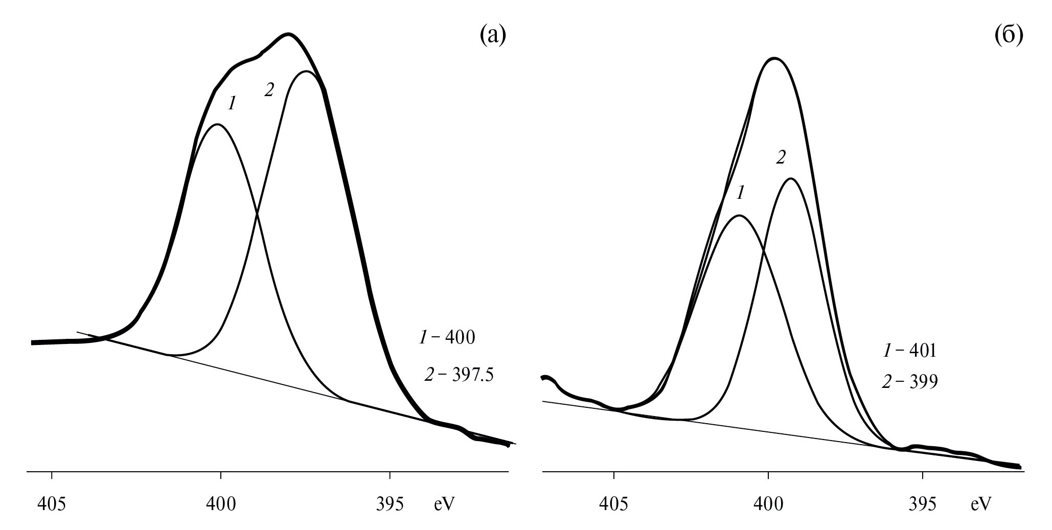 Рис. 1. Разложение энергетического профиля N1s уровня на индивидуальные составляющие для гетероциклического и аминного азота: а – 4-ОАП, б – 4-ОАП·HCl.