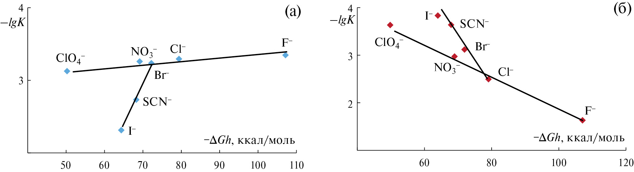 Полученные результаты согласуются с исследованиями ионных пар и процессов мицеллообразования RРу+Х- в воде и органических растворителях (RРу+ − длинноцепочечный алкилпиридиний-ион, X- − анионы различной природы) [9, 25, 26]. На поверхности мицелл в водном растворе обнаружено взаимодействие с переносом заряда (ПЗ) согласно увеличению «мягкости» аниона в ряду Вr-<<SO32-<N3-<I-<S2O32-. Аналогичное взаимодействие в ряду С1-<<Вr-<I- наблюдается для ионных пар в хлороформе и отсутствует в случае «жесткого» ClO4-. ПЗ в ионных парах и на поверхности мицелл отсутствует в случае «жестких» С1-, NO3-, NO2-, ClO3-, ВrО3-, IO3-, НСОО-, SO42-, а также в ионных парах «жестких» катионов тетраалкил- и тетраалкилфениламмония с «мягкими» Вг- и I-. Различие в свободной энергии адсорбции «мягкого» I- и «жесткого» С1- на поверхности мицелл составляет 1.7±0.5 ккал/моль [26].