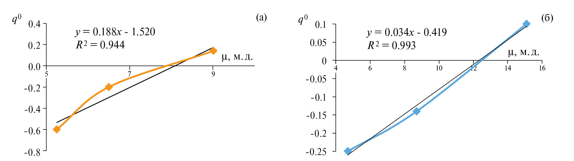 Рис. 4. Корреляции между эффективным зарядом (qo) и химическим сдвигом (μ) протонов при атомах азота: а) 4-ОАП и его хлорид; б) 2-ОАП и его хлорид.