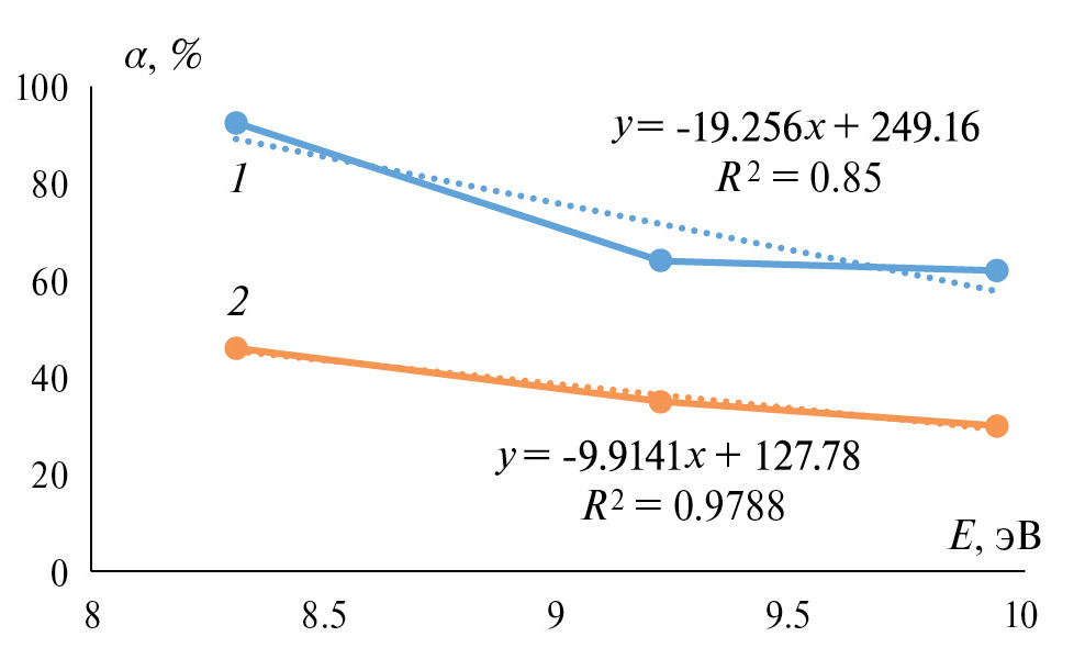Рис. 6. Делокализация заряда (α, %) в катионе 2-ОАП (1) и 4-ОАП (2) в зависимости от параметра «мягкости» (Е, эВ) галогенида в ряду С1->Вr->I-.