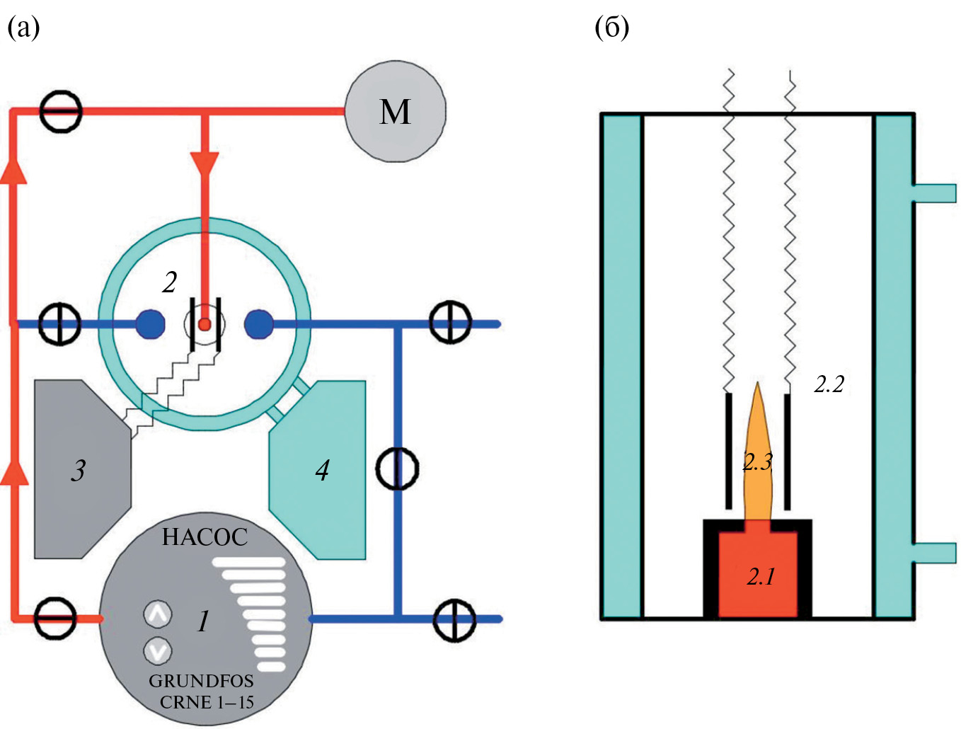 Эксперименты проводили на лабораторной установке (рис. 1), которая включала в себя: вертикальный центробежный многоступенчатый насос Grundfos CRNE-15 с частотным преобразователем (1), кавитационную камеру (2), генераторы акустической кавитации (3), термостат (4) и манометр. В кавитационной камере (рис. 1б) расположены форсунка из титана со внутренним диаметром 10 мм, диаметром выходного отверстия 4 мм, высотой 30 мм (2.1), а также ультразвуковые пьезокерамические преобразователи (2.2), подключенные к акустическим генераторам 1.7 МГц (3), расстояние между пьезоэлементами – 10 мм. Общий объем обрабатываемого раствора составлял 6.4 л. Все эксперименты проводились в термостатированных условиях, при температуре 25°С. Основные элементы установки, контактирующие с обрабатываемым раствором, изготовлены из нержавеющей стали. Потребление электроэнергии контролировали с помощью энергомонитора (Voltcraft Energie Monitor 3000, Conrad Electronic SE, Германия, точность: ±1%). Потребляемая мощность для генерирования АК составляла 50 Вт, а для ГК при давлении Рвх=5 атм – 400 Вт.