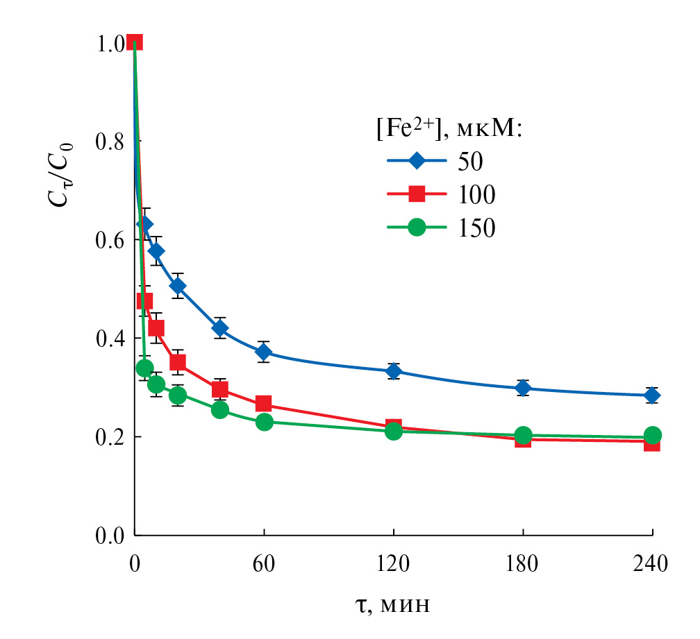 Экспериментально установлено, что концентрация Fe2+ оказывает значительное влияние на степень деструкции ЦЕФ в системе ГАК/ПС/Fe2+ (табл. 1, рис. 3). При увеличении концентрации Fe2+ с 50 мкМ до 100 мкМ начальная скорость реакции окисления ЦЕФ возросла на 34 %, а степень деструкции – с 67 до 78 % после двухчасовой обработки. Дальнейшее увеличение концентрации ионов железа до 150 мкМ приводит к увеличению начальной скорости реакции окисления ЦЕФ, но не оказывает существенного влияния на эффективность процесса (после 120 мин обработки), поэтому в наших дальнейших исследованиях была принята концентрация 100 мкМ.