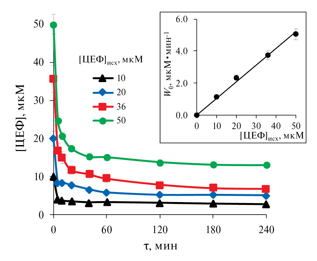 Изменение концентрации ЦЕФ в растворе контролировали методом ВЭЖХ (Agilent 1260 Infinity с диодно-матричным УФ-детектором, колонка Zorbax SB-C18 4.6x150 мм). Объем пробы – 95 мкл, температура – 25°С, элюент – ацетонитрил:фосфорная кислота (0.1%) (30:70). Скорость элюирования – 0.3 мл/мин. Перед анализом пробы доводили до рН 7–8 0.1% раствором NaOH и фильтровали через мембранные фильтры ФМПТФЭ-0.45 мкм (ЗАО «Владисарт», Россия).