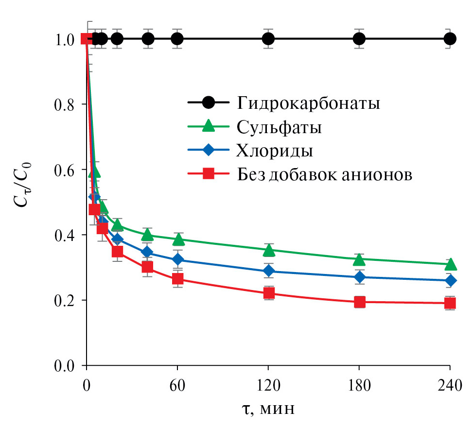 Взаимодействие неорганических анионов, присутствующих в реальных водных матрицах, с АФК может привести к изменению типа и концентрации радикалов и, как следствие, существенно влиять на эффективность удаления органических загрязняющих веществ. Влияние неорганических анионов на эффективность окислительной деструкции является сложным и зависит от свойств целевых соединений, анионов, окислителя и их концентрации [48, 49].
