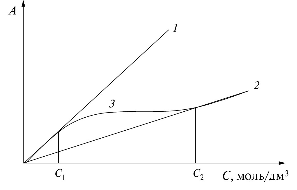 Кривая 3 описывает зависимость А = f(C) в случаях, когда C1<C<C2, 0<α<1, при этом . На малых концентрациях оптическая плотность слабых электролитов совпадает с прямой 1 (C<C1, α→1 и ), а на больших – приближается к прямой 2 (C>C2, α →0 и ).
