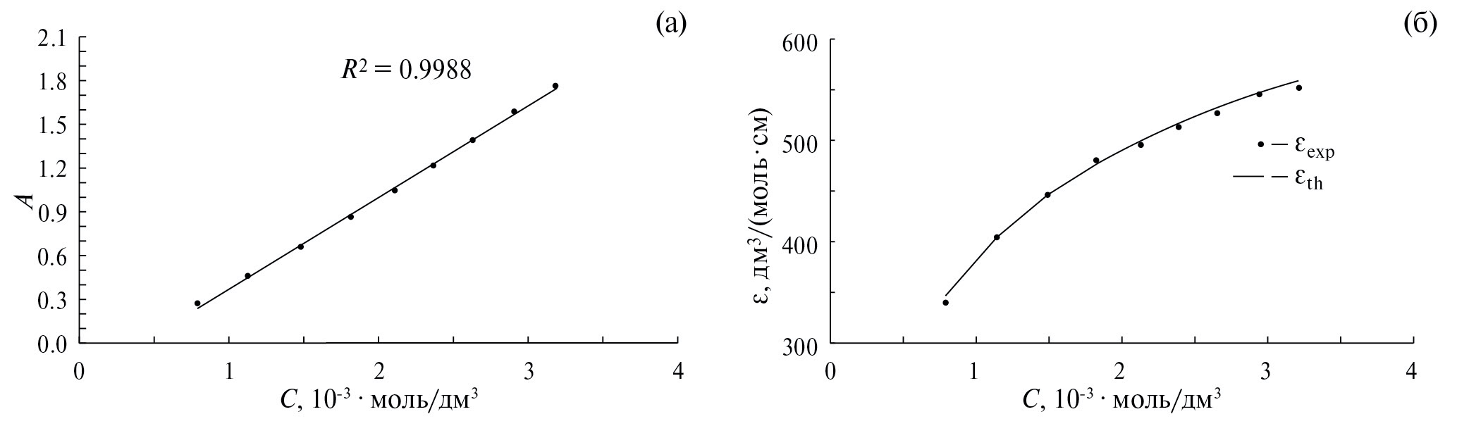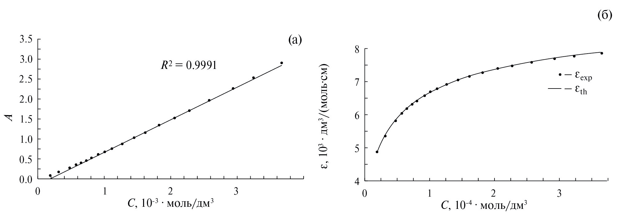 При проведении спектрофотометрических измерений мы постоянно сталкивались с тем, что экспериментально определяемый молярный коэффициент поглощения εнабл слабого электролита не является постоянной величиной и изменяется в зависимости от концентрации исследуемого соединения, при этом зависимость А = f(C) имела практически линейный вид с коэффициентом корреляции r ≈ 0.99. Стоит отметить, что исследуемые концентрации во многих случаях не превышали значений 10–3 моль/дм3. В этих растворах с очень низкой ионной силой (I → 0) обычно пренебрегают межмолекулярными взаимодействиями и ассоциацией, считая такие растворы близкими к идеальным.