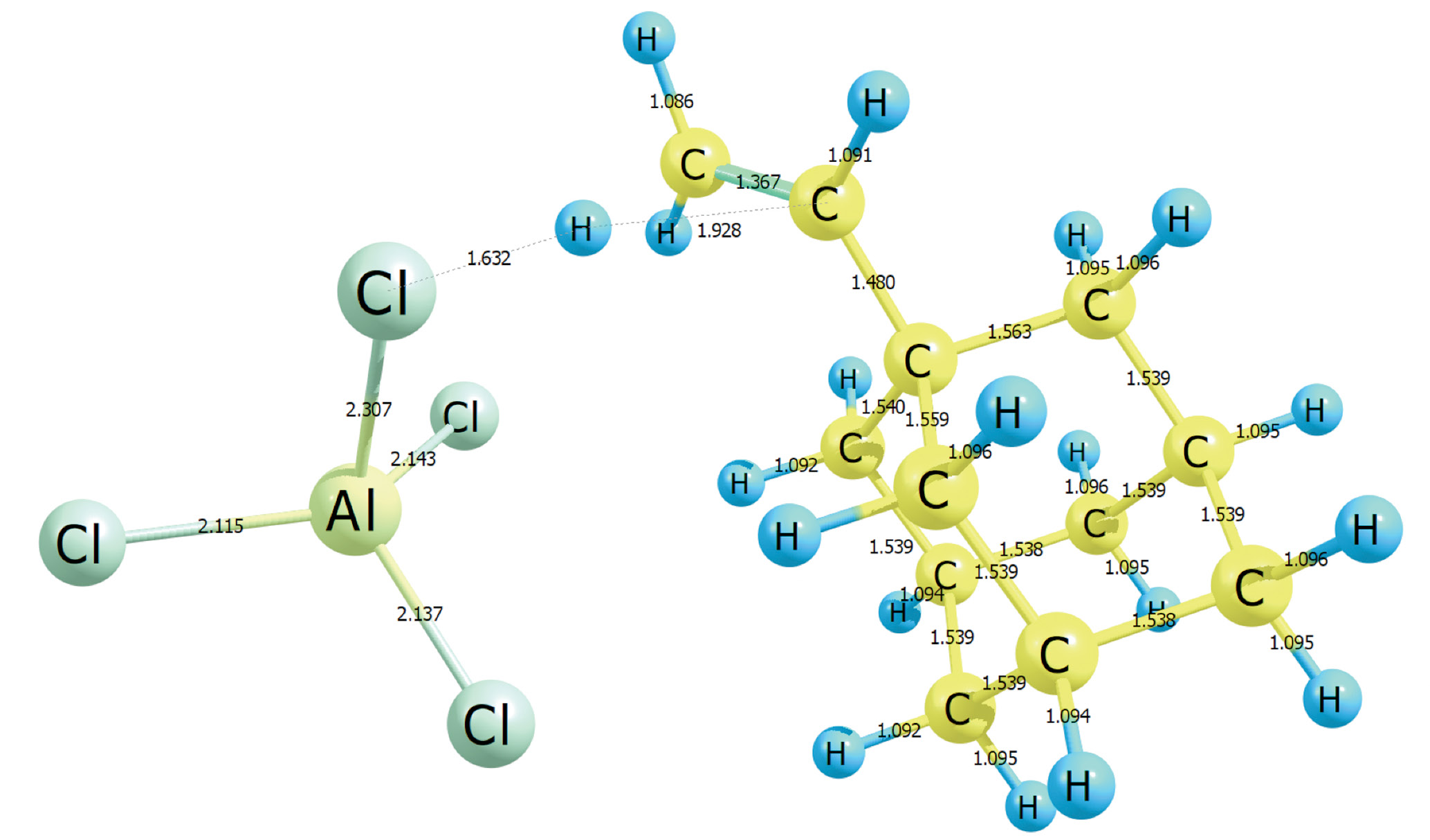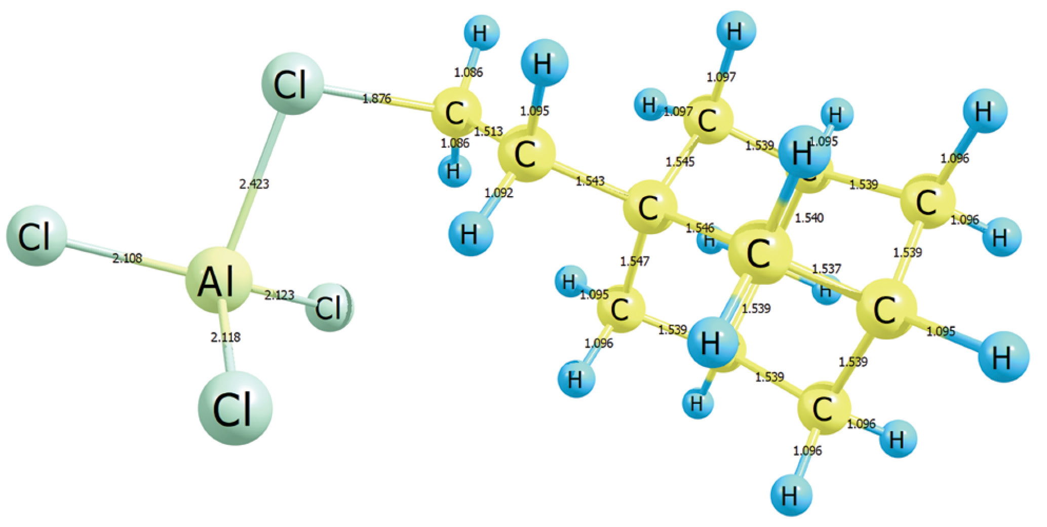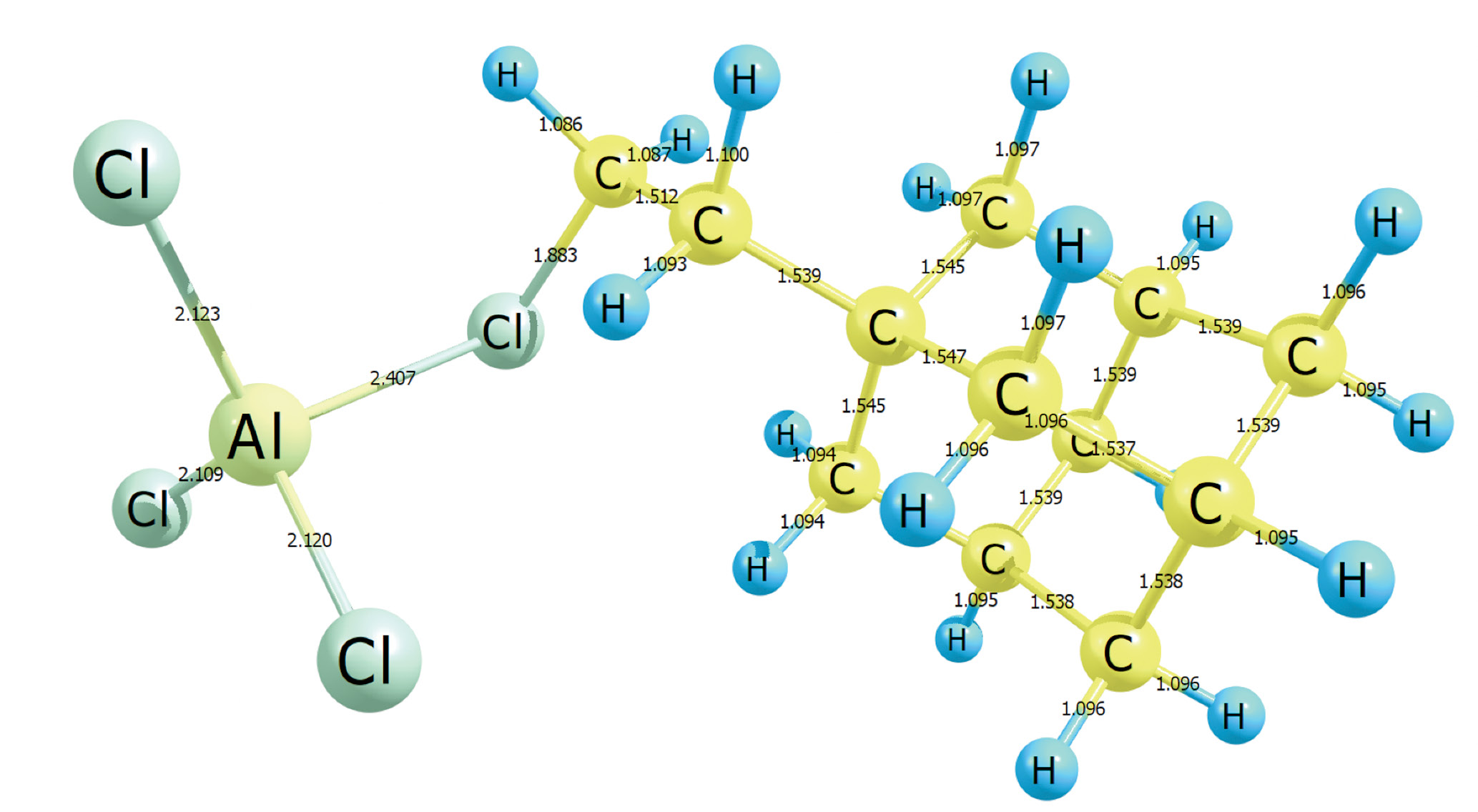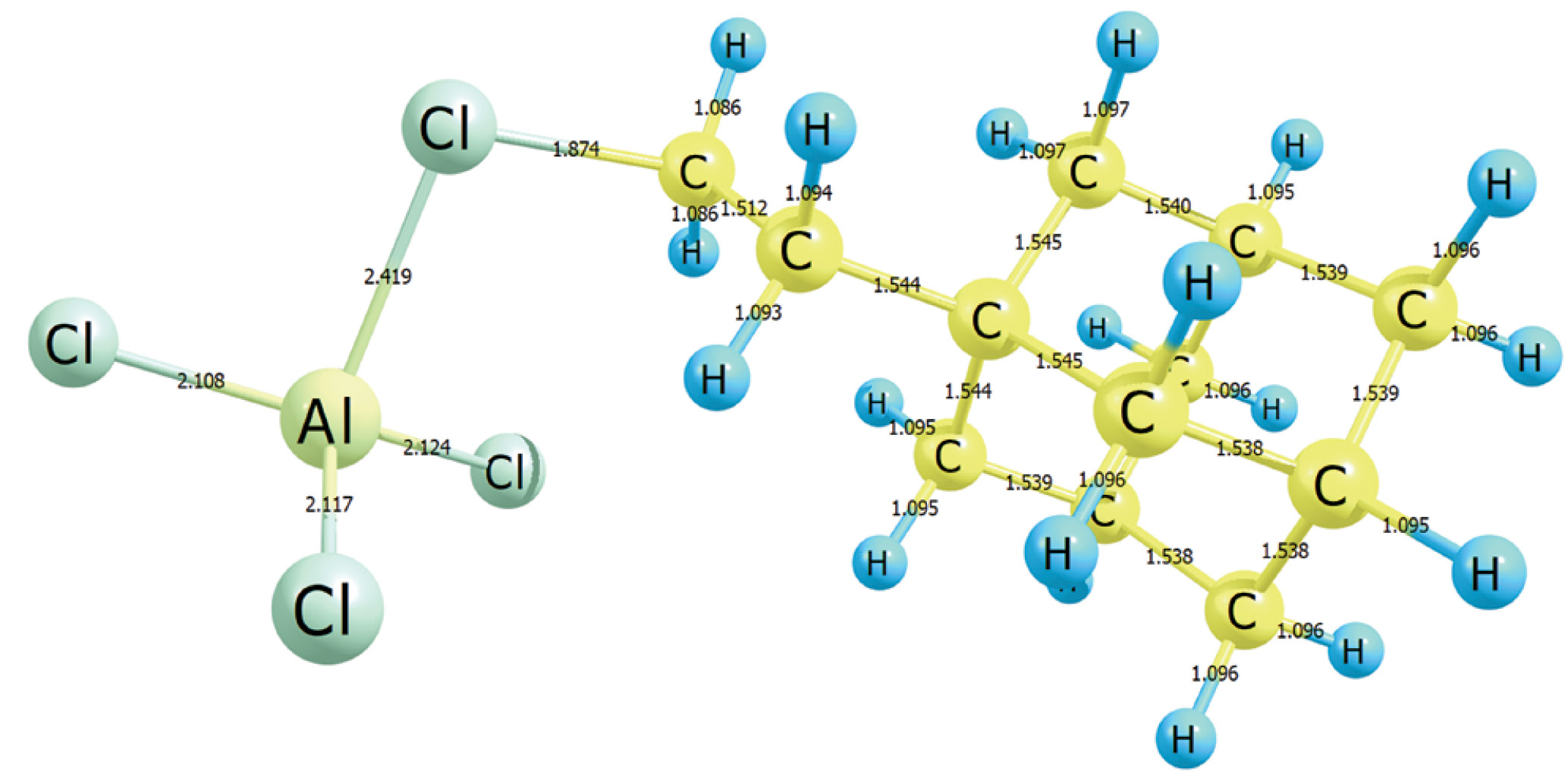 Стоит отметить, что данная атомно-молекулярная система является скорее молекулой Ad-CH2-CH2-AlCl4, нежели комплексом Ad-CH2-CH2+ • AlCl4- ввиду отсутствия стабильной формы катиона Ad-CH2-CH2+, как было показано выше.