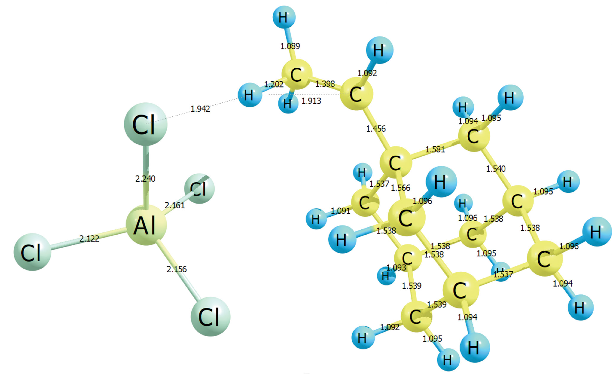 Рис. 5. Геометрическая структура переходного состояния реакции Ad-CH+-CH3 • AlCl4- → Ad-CH=CH2 + AlCl3 • HCl. Расстояния указаны в ангстремах (Å).
