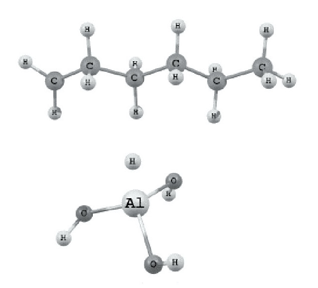 E0 = -707.097194 а.е. q = 0, M = 1 E0(н-С6Н14) = -236.965149 а.е. E0 [Al(OH)3] = -470.127029 а.е. ∆E(адсорбции)= -3.1 ккал/моль | (C6H13)= 0.1435; 0.8565 E0 = -707.090525 а.е. q = -1, M = 2 ∆Е0 = 4.2 ккал/моль |