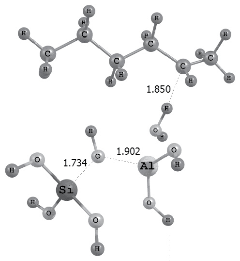 Результаты расчетов взаимодействия н-гексана со структурными моделями алюмосиликатов, выполненные методом b3lyp/6-31g(d) с оптимизацией всех геометрических параметров в модели «супермолекула» с зарядом, равным q=0 и q=1, показывают, что в случае q=0, когда окружение атома Al имеет тетраэдрическую структуру, водород, оторванный от н-гексана с ОН-группой окружения Al, образует Н2О. При этом атом Al меняет гибридизацию с тетраэдрической на тригональную (табл. 5). Следует отметить, что гидроксильные группы Si в аналогичной реакции не участвуют. Радикал н-гексана С6Н13• имеет высокий положительный заряд (C6H13) = 0.4569, т.е. образуется карбокатион. Реакция экзотермическая DE0= -17.7 ккал/моль. В случае H-ZSM-5, когда «супермолекула» имеет заряд q=1, механизм отрыва водорода аналогичен случаю q=0, но отток электронной плотности происходит на радикал С6Н13• и реакция более экзотермична, чем в первом случае: DE0= - 27.8 ккал/моль.